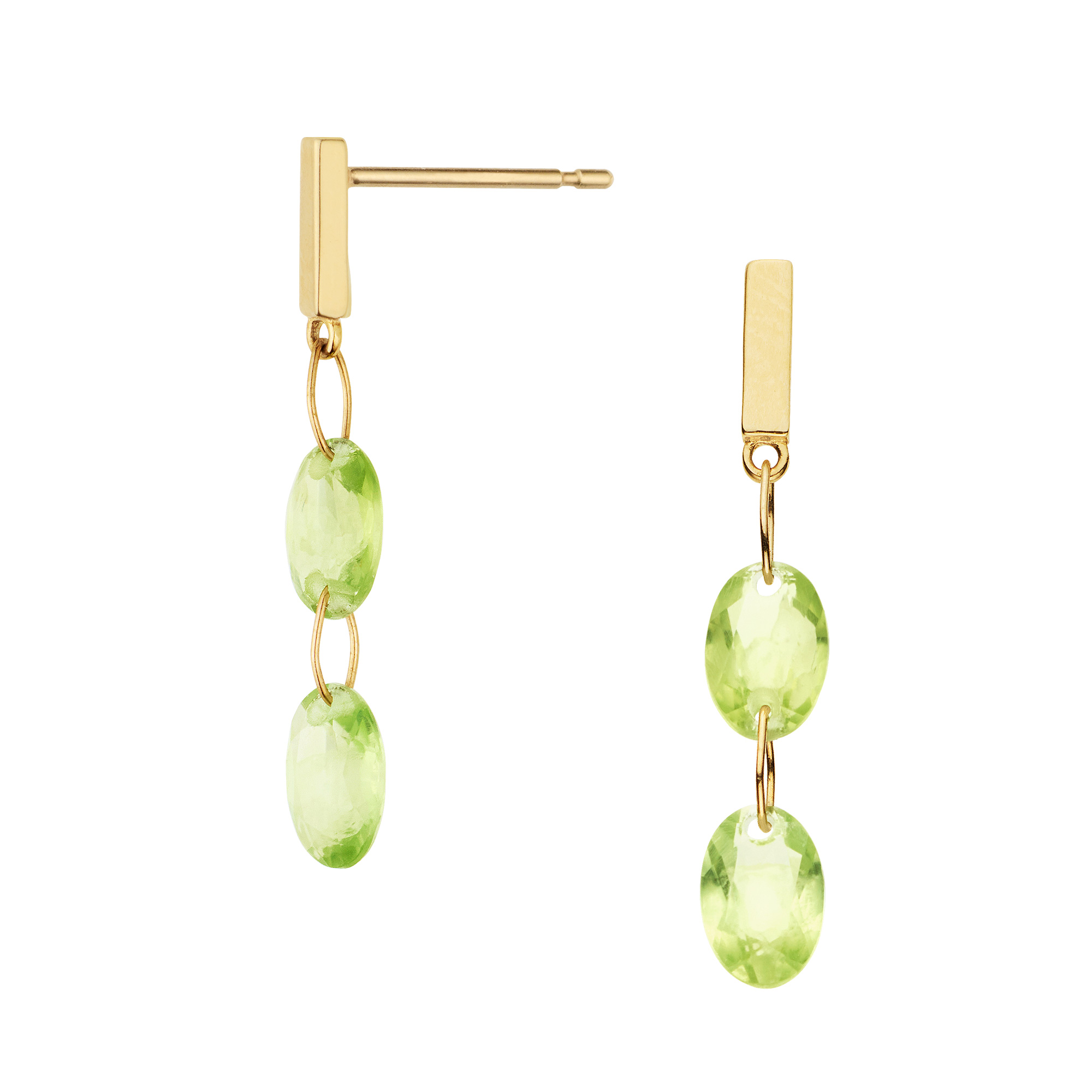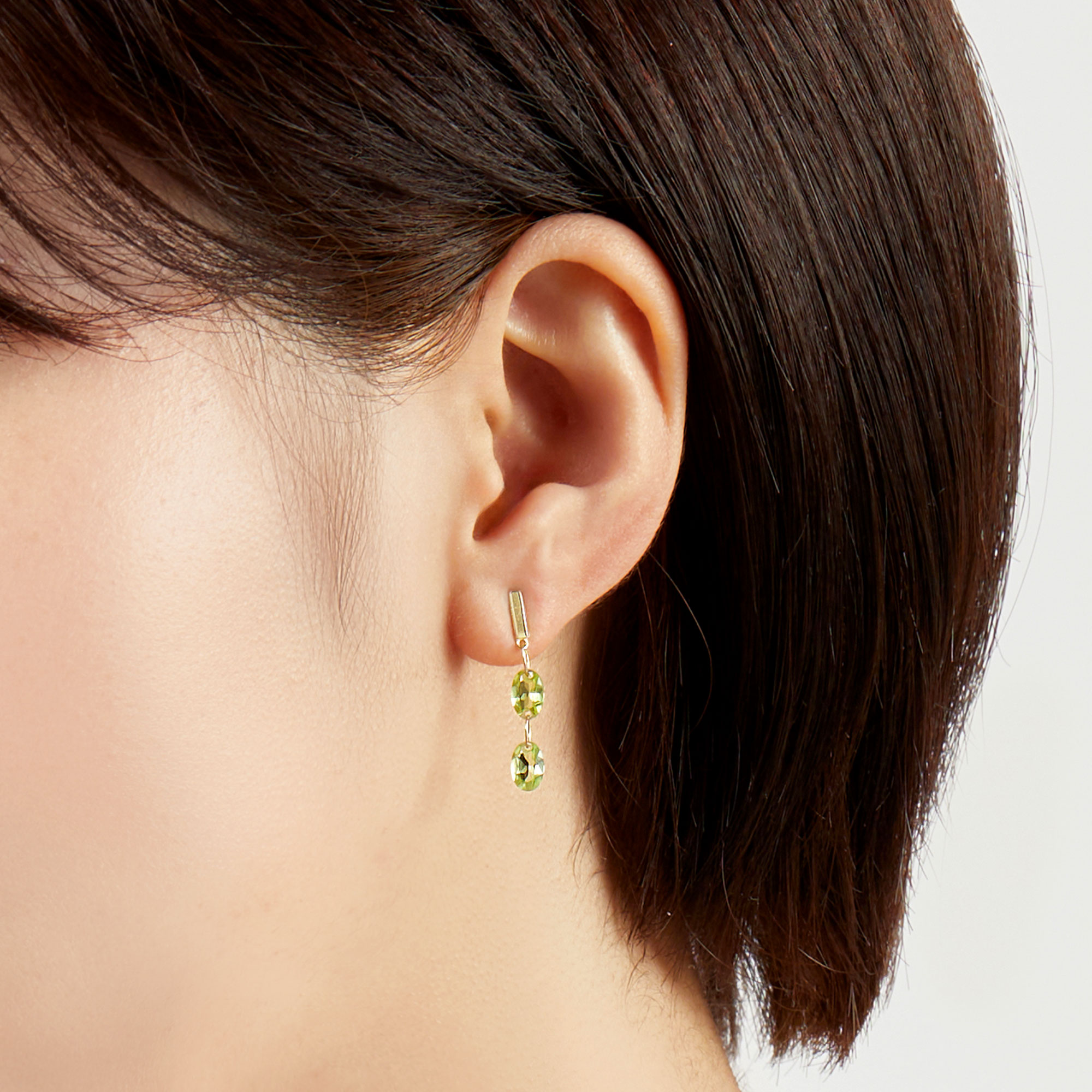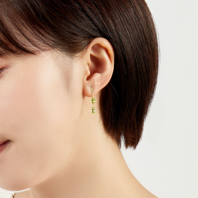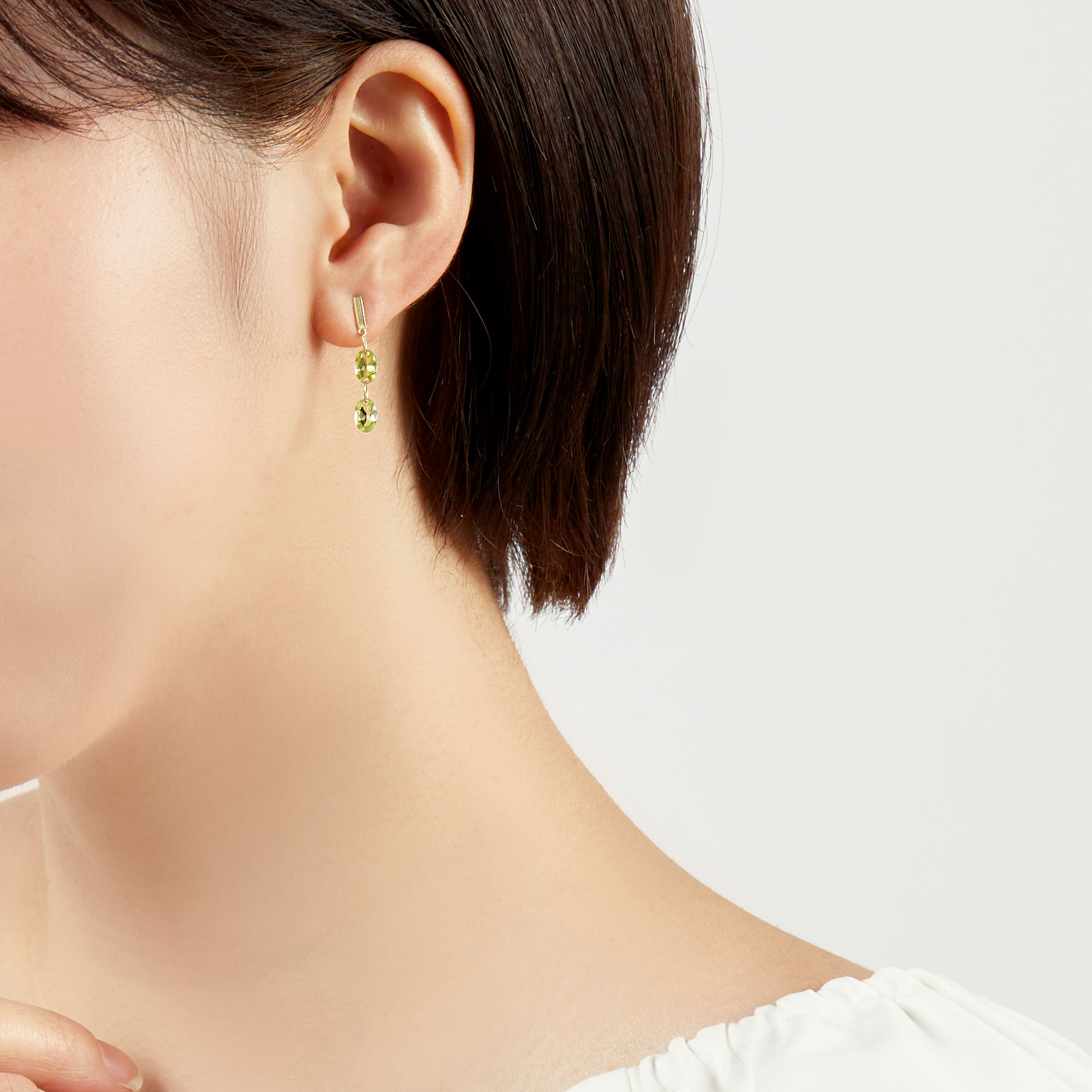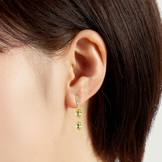 オーバルのフォルムが優しく上品なペリドットと、ソリッドなゴールドのバーのコントラストが横顔にモダンな輝きを演出。