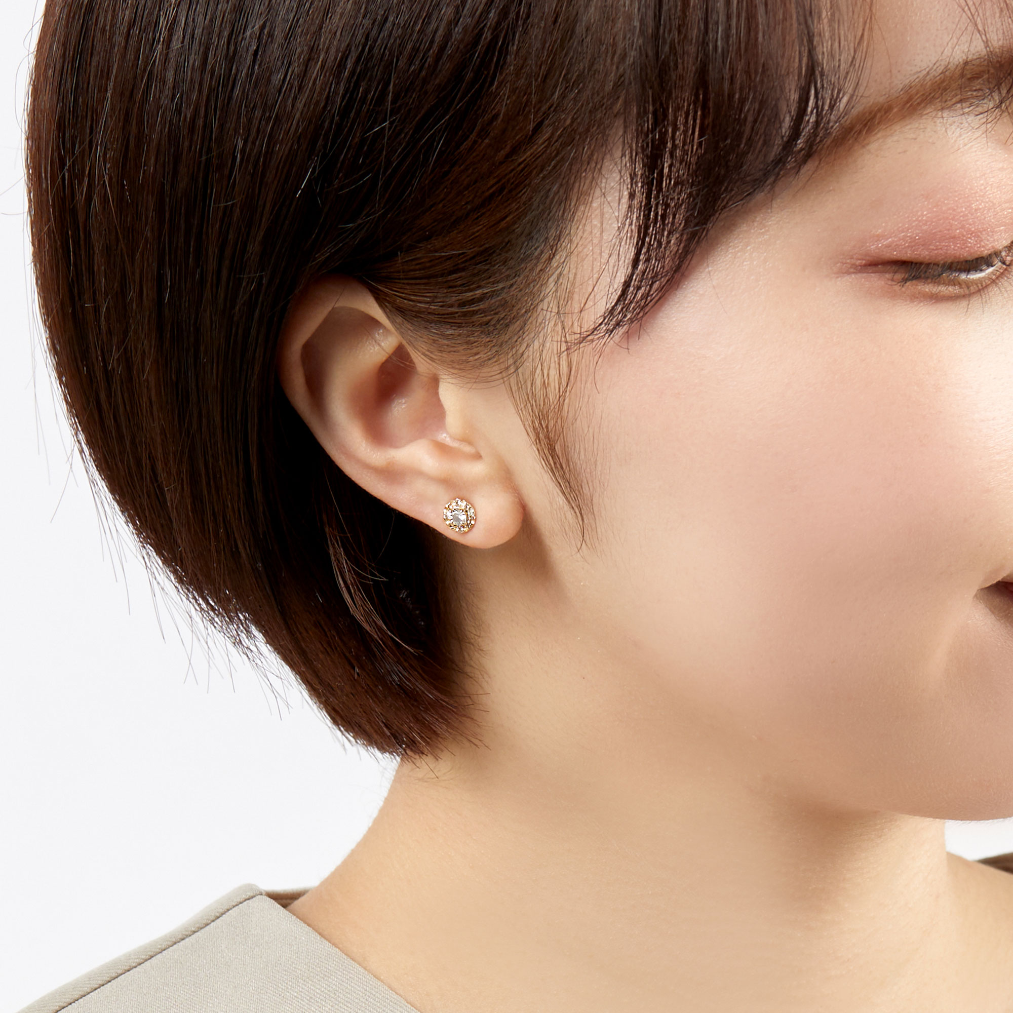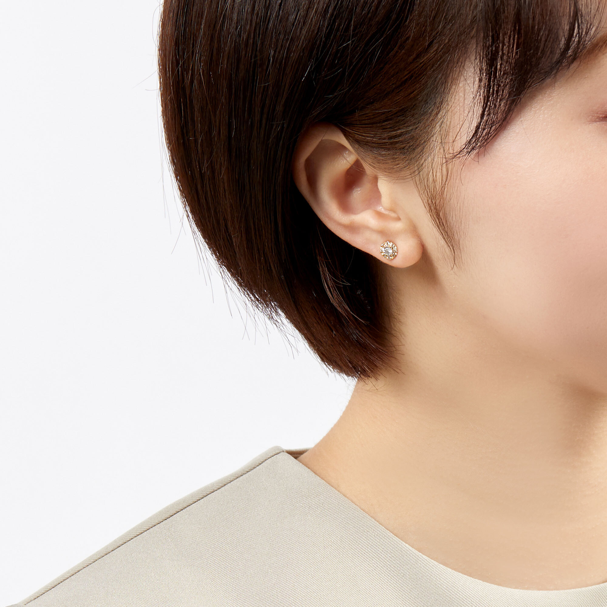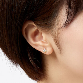 大粒のセンターストーンと取り巻く繊細なストーンの光が互いに響き合い、横顔に優美なきらめきが広がります。