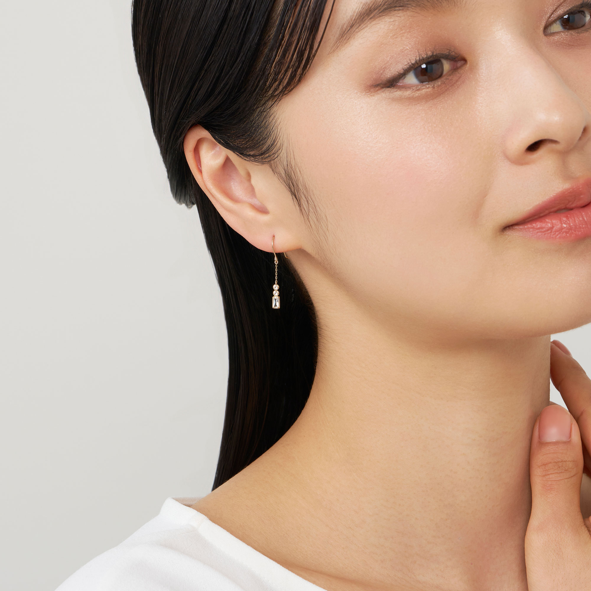 リズム感のある輝きと計算された配置が揺れるたびに光を捉え、顔まわりにみずみずしい透明感をもたらします。