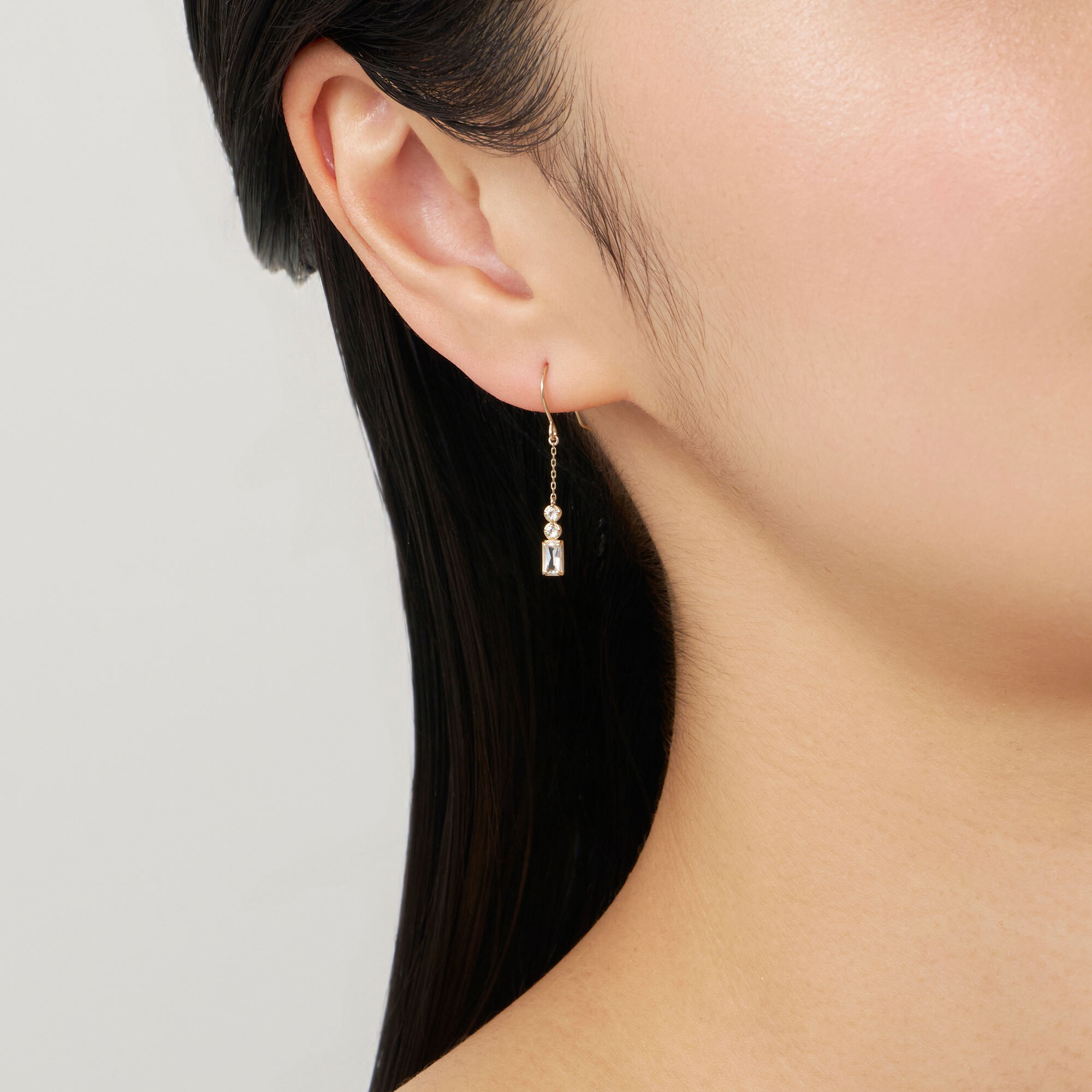 シェイプの異なるホワイトトパーズが縦のラインで揺れるピアス。