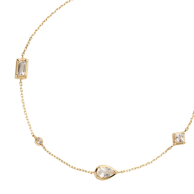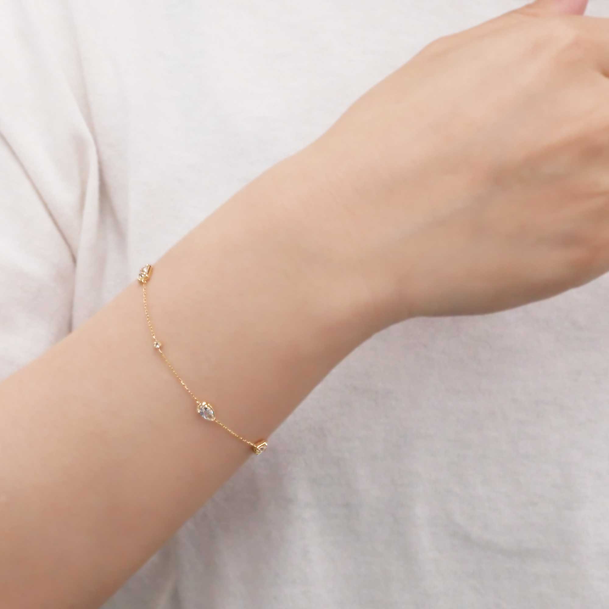 チェーンの繊細なきらめきとクォーツの瑞々しさが手元を女性らしく見せてくれる、コーディネートのアクセントにおすすめのブレスレットです。