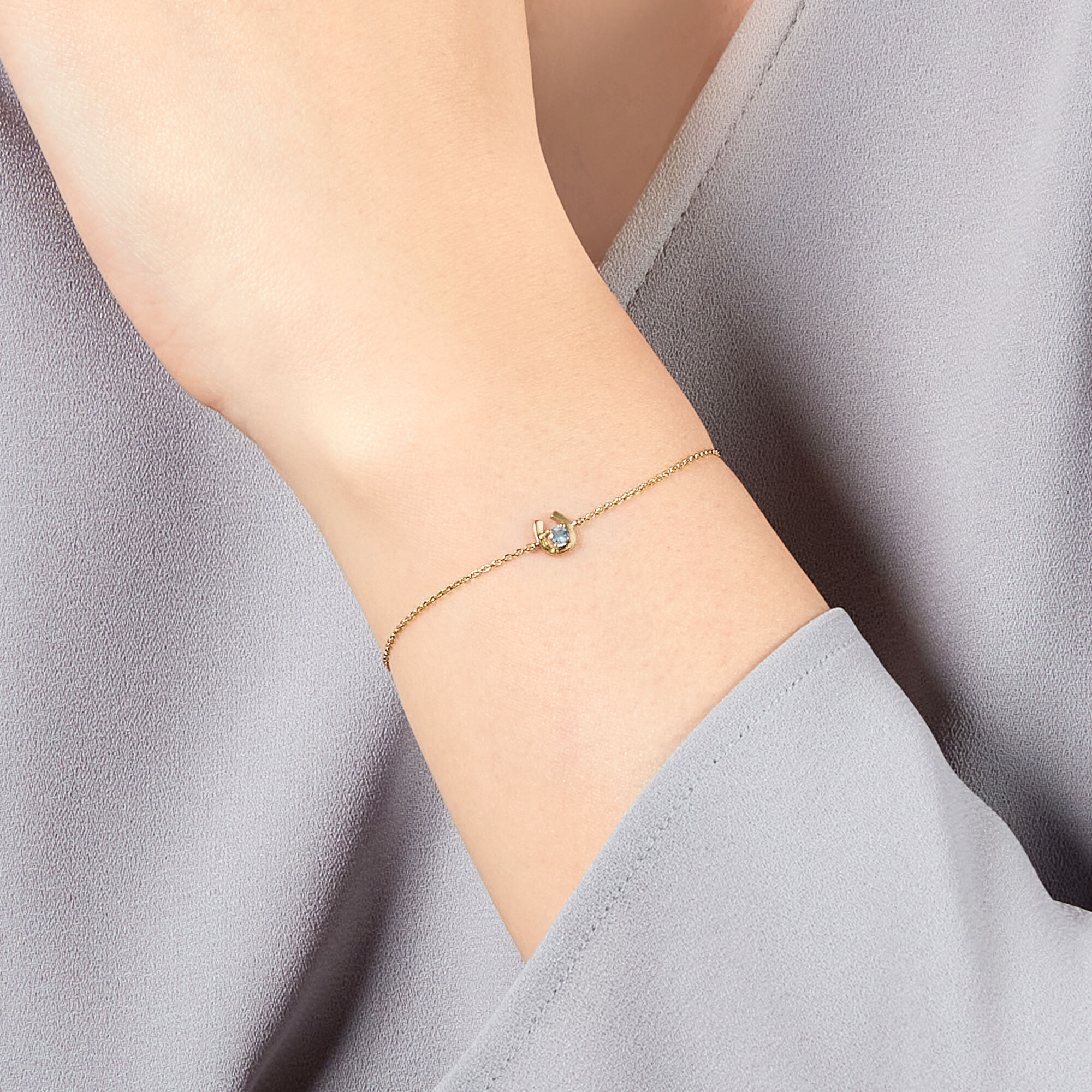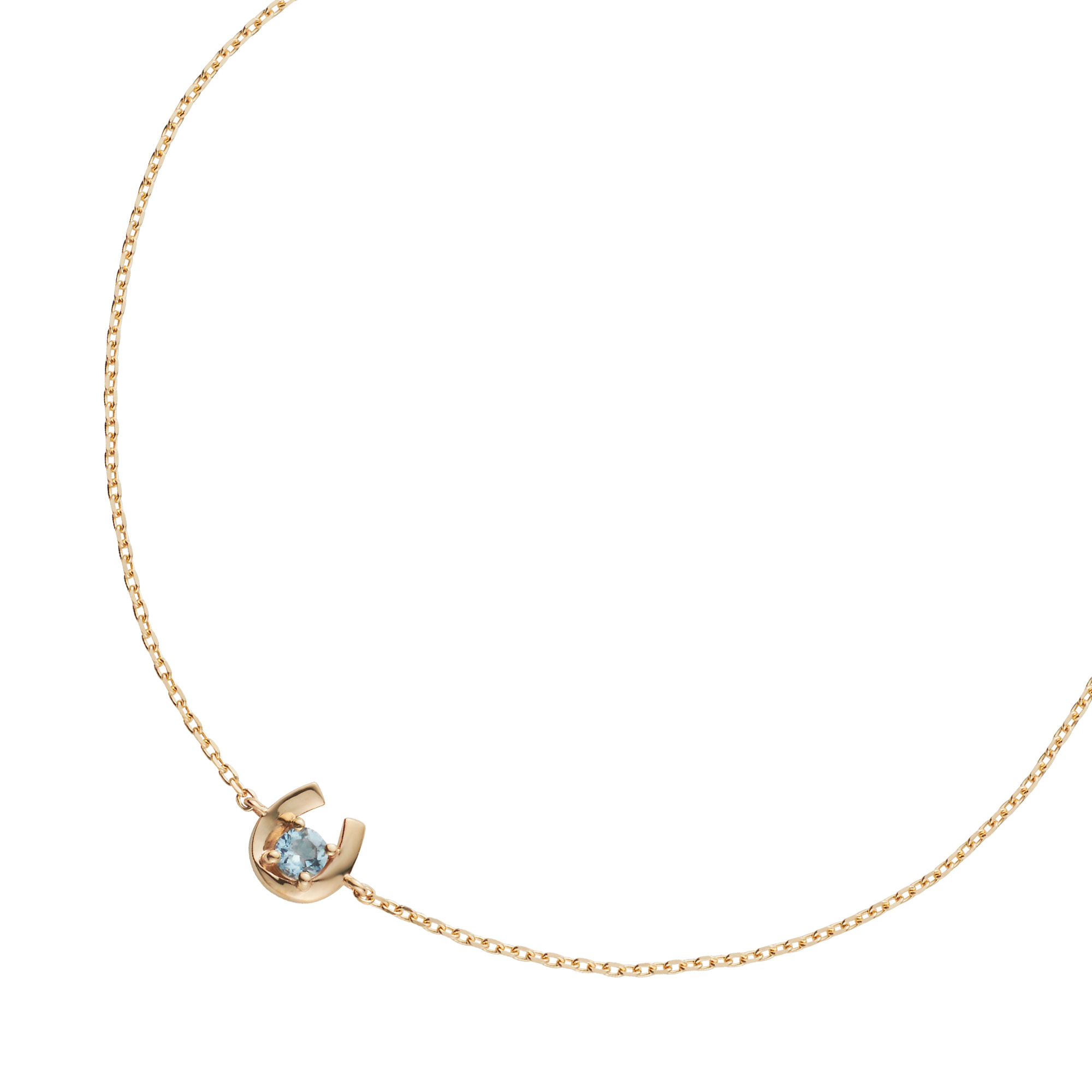 イエローゴールドで軽やかに描かれた馬蹄の中心には1石のアクアマリンが瑞々しく輝きます。