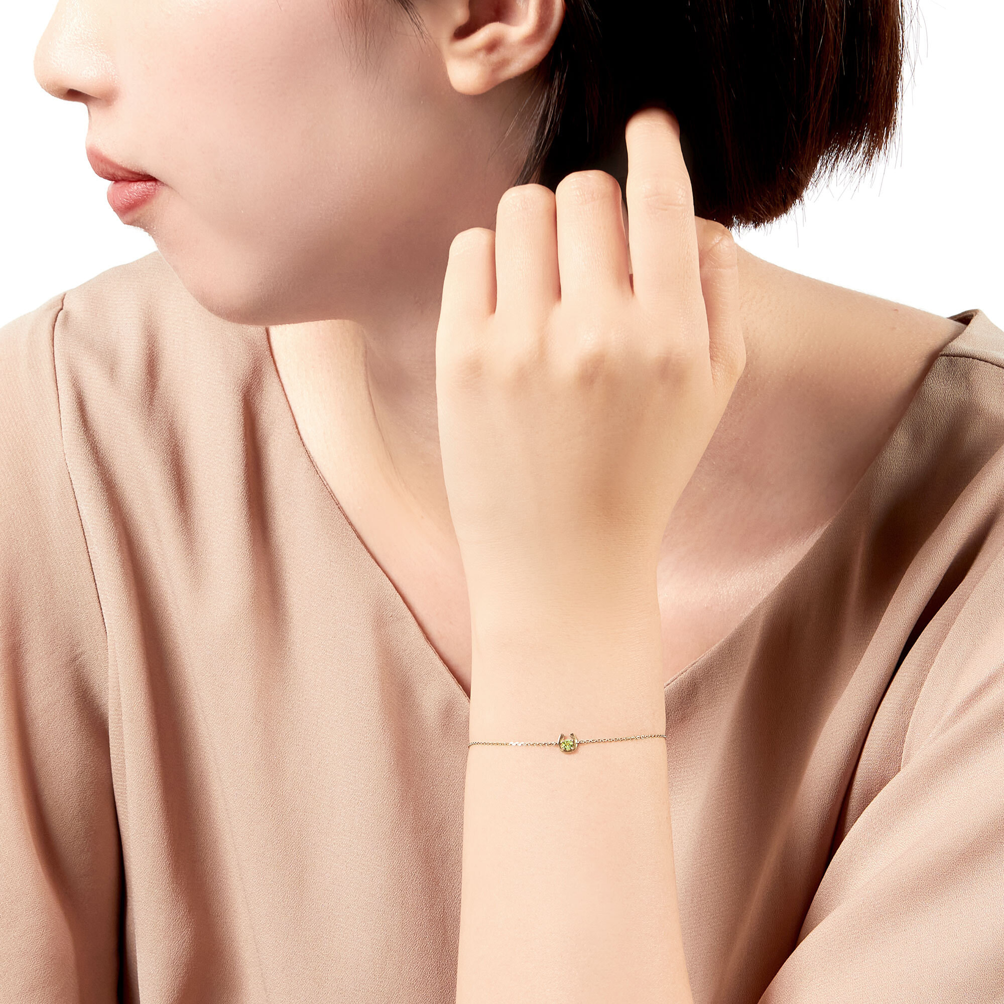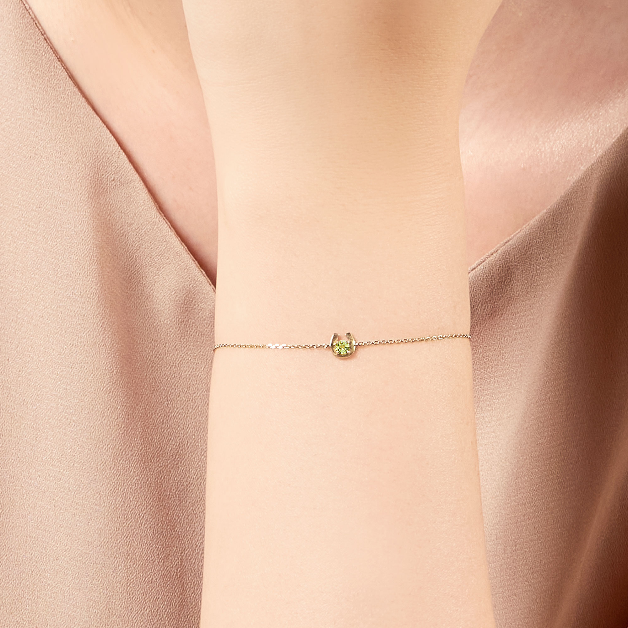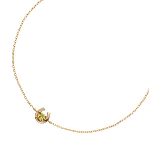 イエローゴールドで軽やかに描かれた馬蹄の中心には1石のペリドットが瑞々しく輝きます。