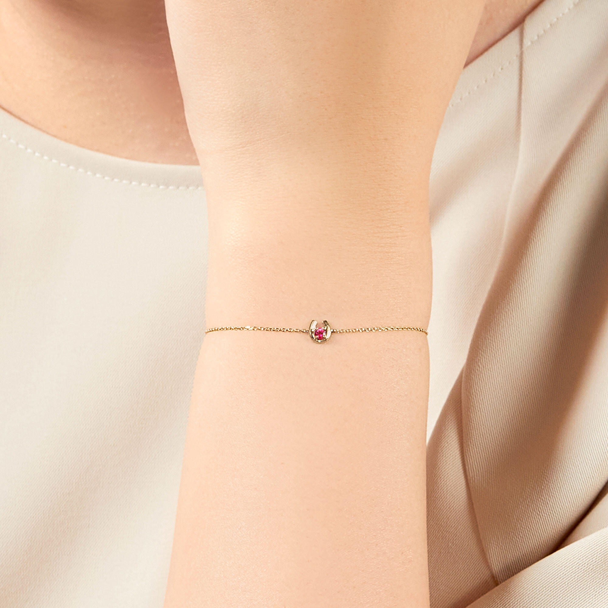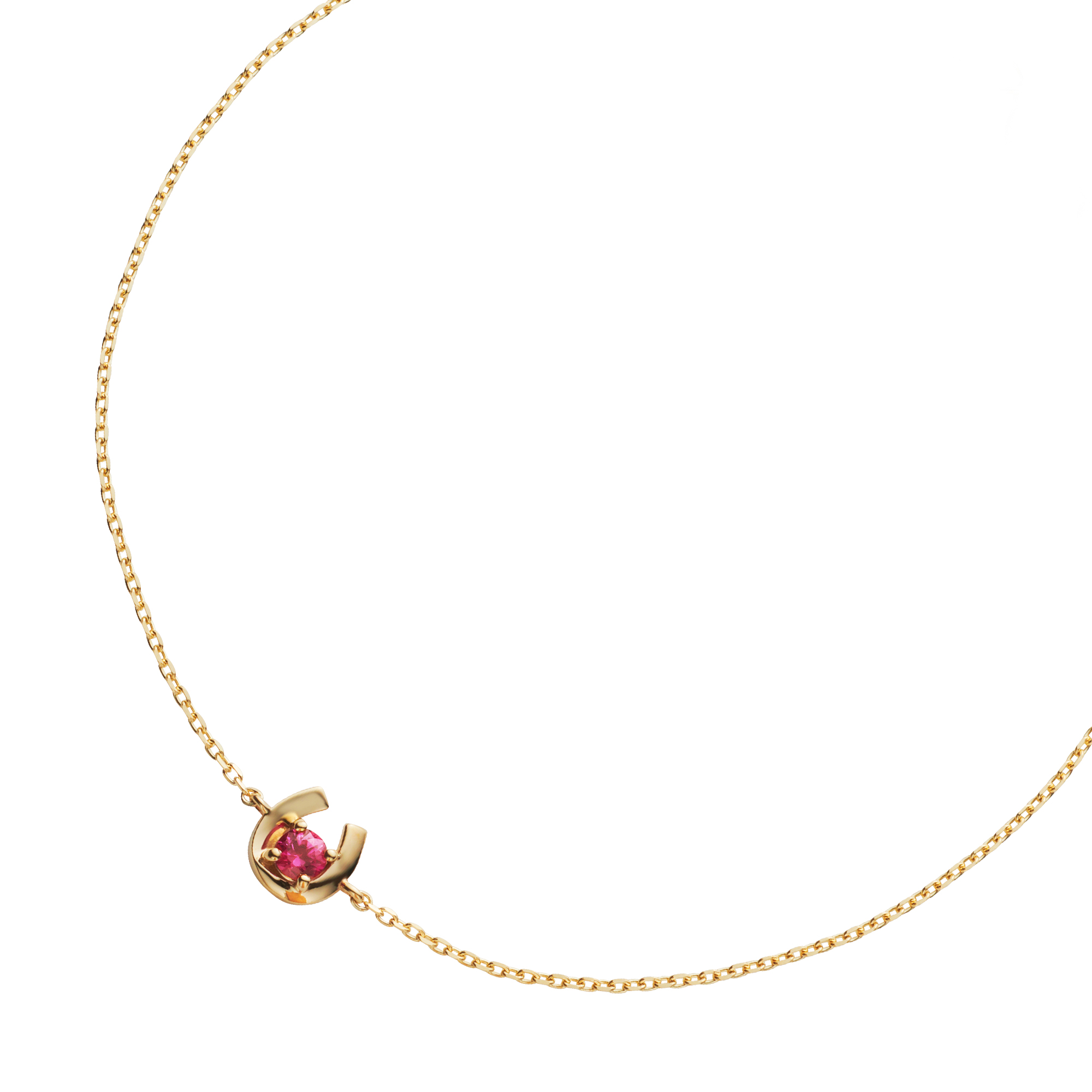 イエローゴールドで軽やかに描かれた馬蹄の中心には1石のルビーが鮮やかに輝きます。
