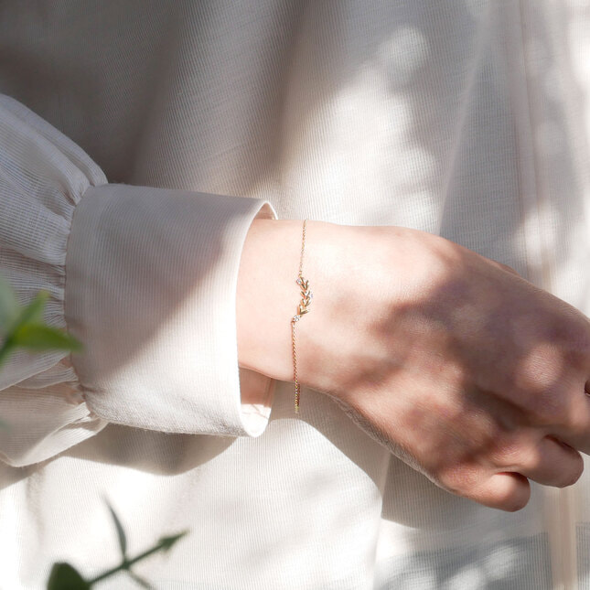 風に揺らぐゴールドの葉と瑞々しく輝くダイヤモンドのブレスレット。