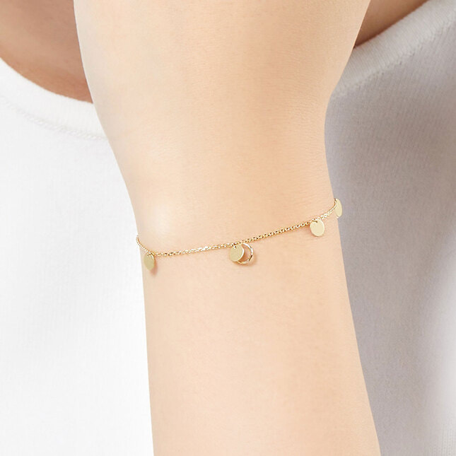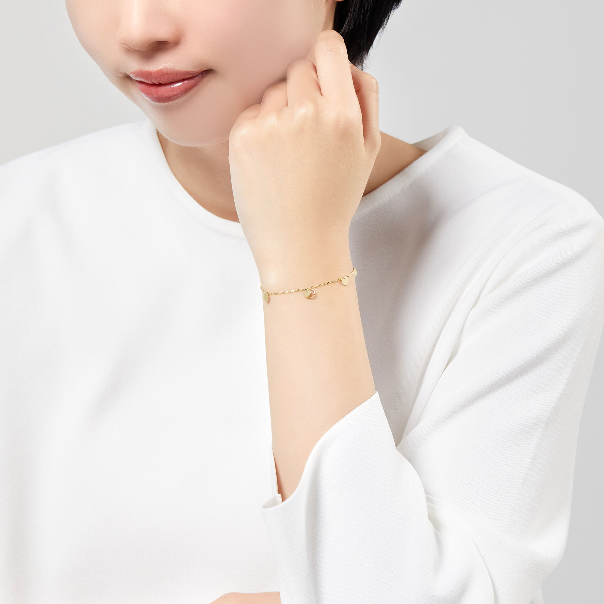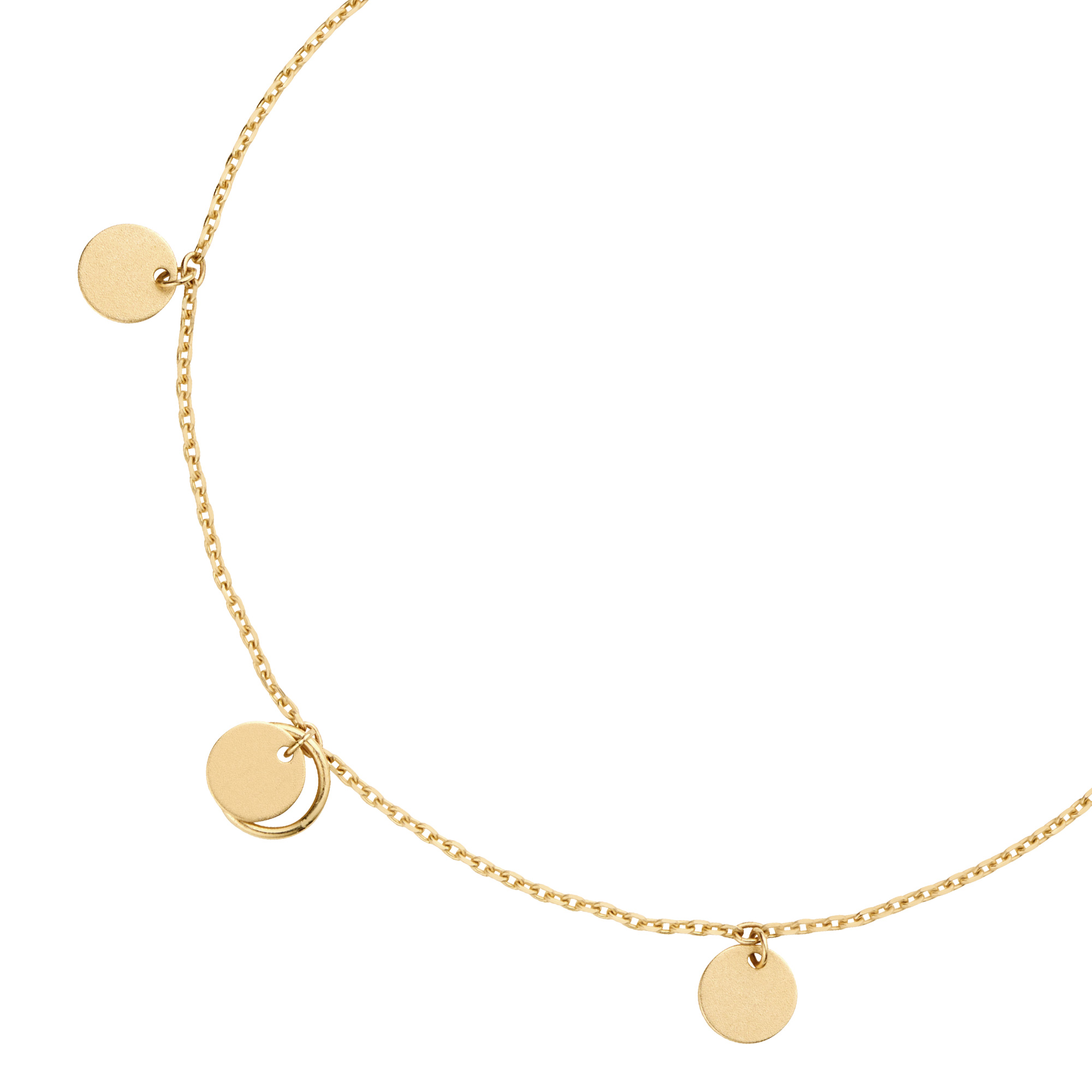 チェーンの繊細なきらめきに丸いプレートが下がり、揺れるたびにゴールドの陰影が表情を与えます。