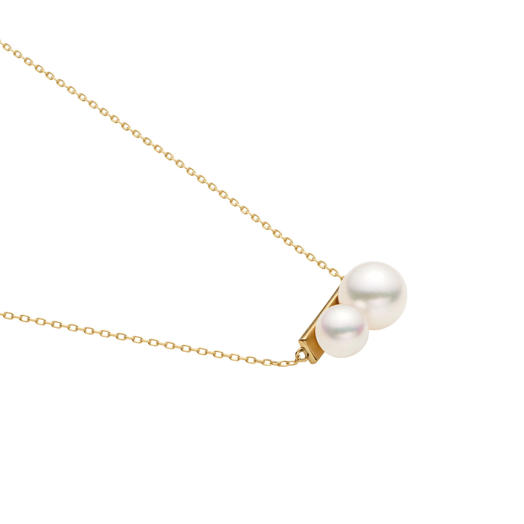 人気のバータイプに大小2石のアコヤパールが配置された個性的なネックレス。