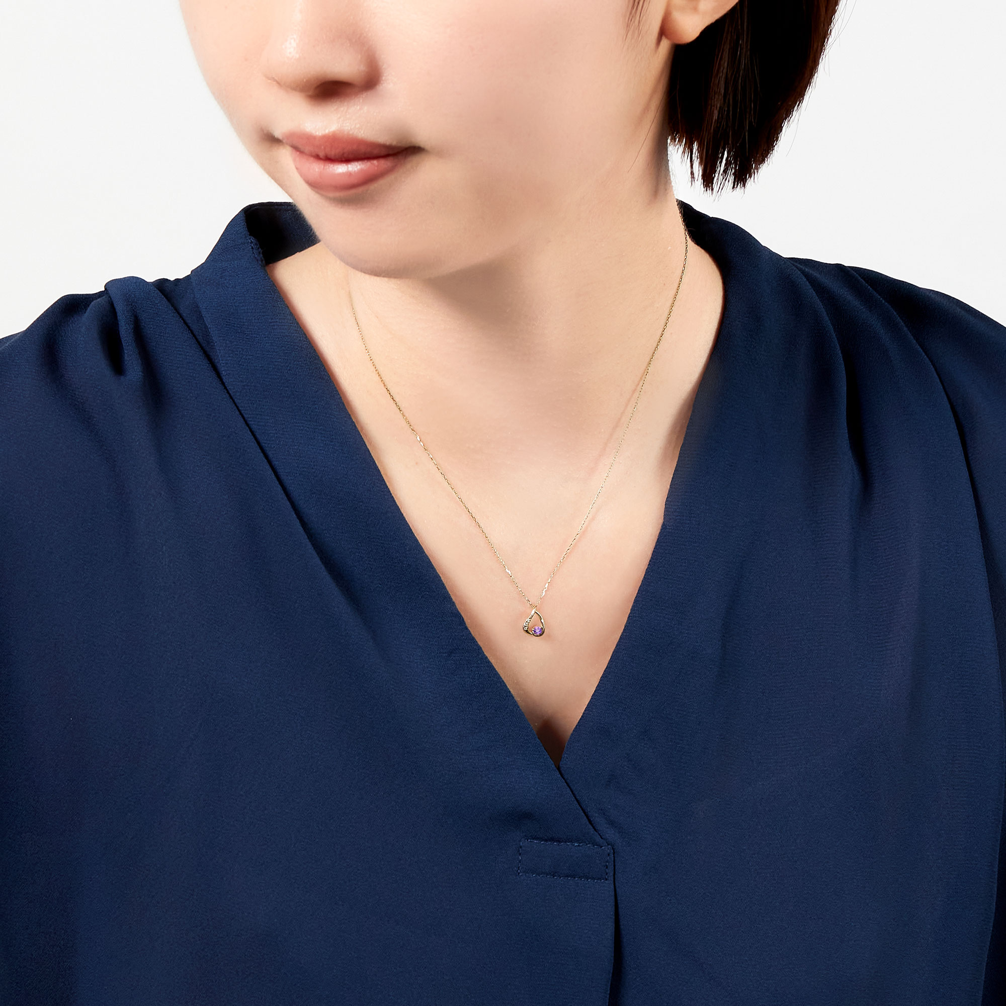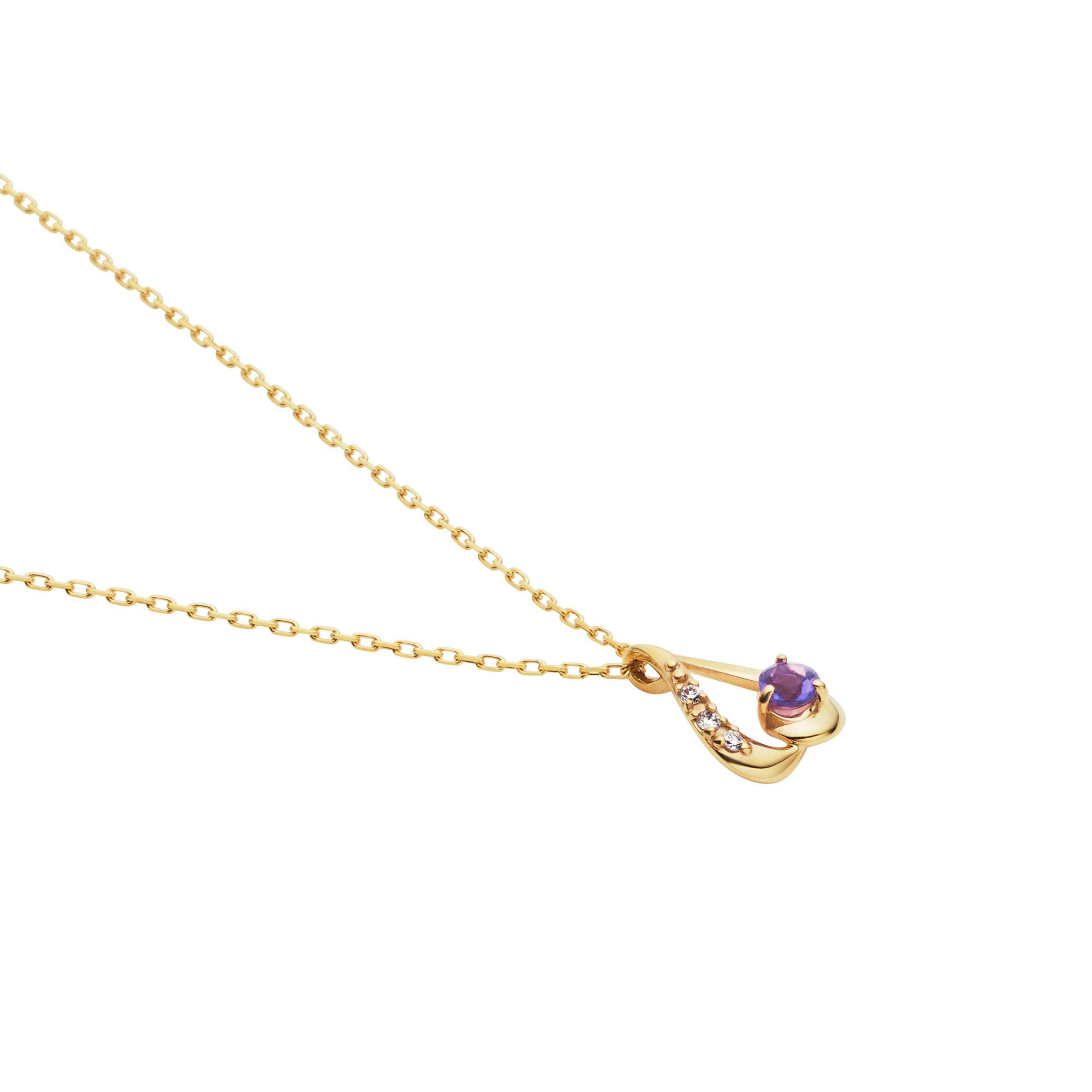 艶やかなイエローゴールドで描かれたドロップモチーフにさり気無くメレダイヤが輝くカラーストーンネックレス。