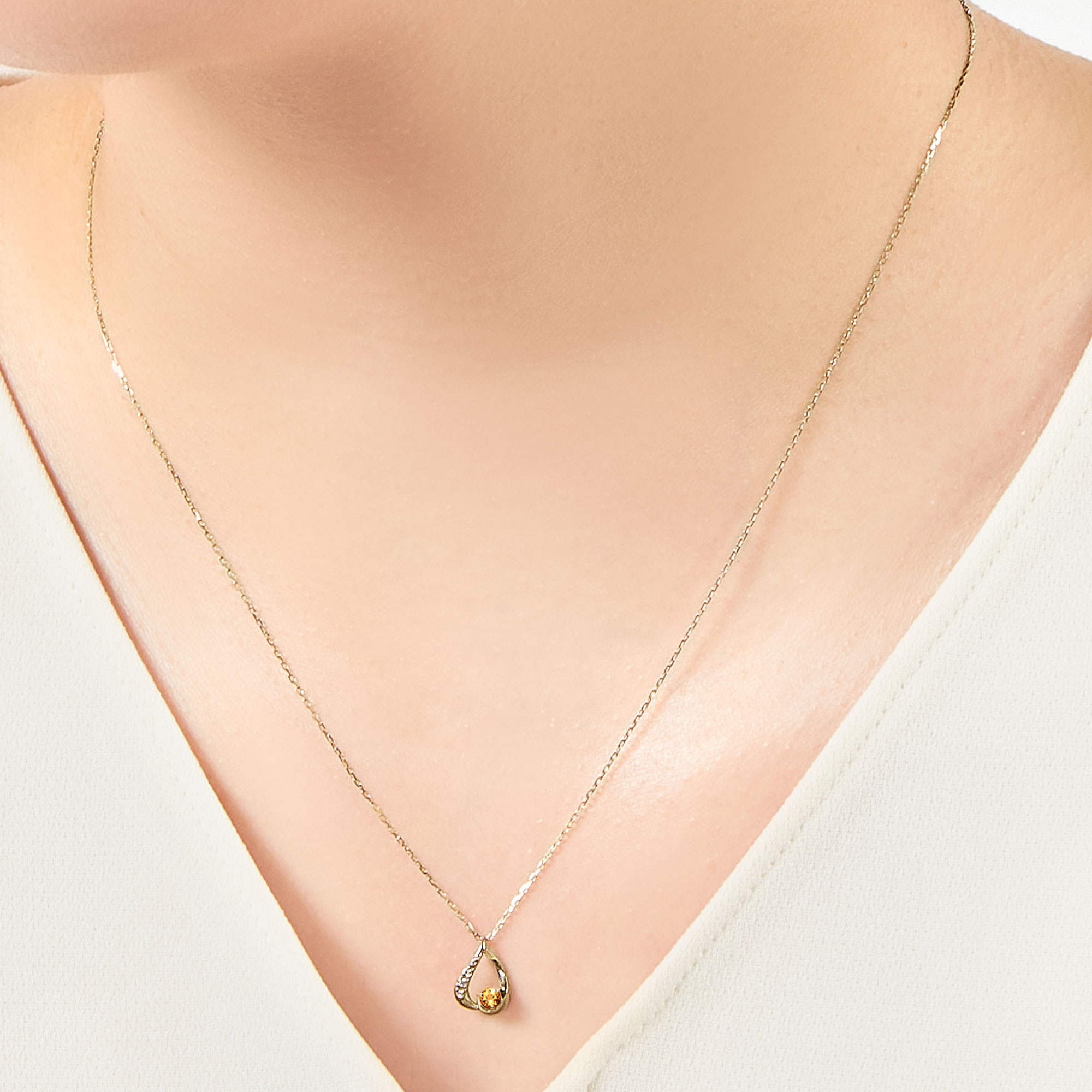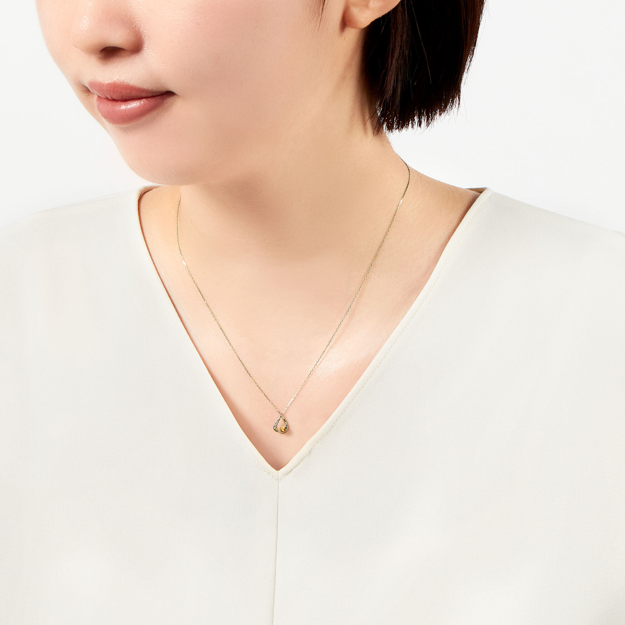 艶やかなイエローゴールドで描かれたドロップモチーフにさり気無くメレダイヤが輝くカラーストーンネックレス。