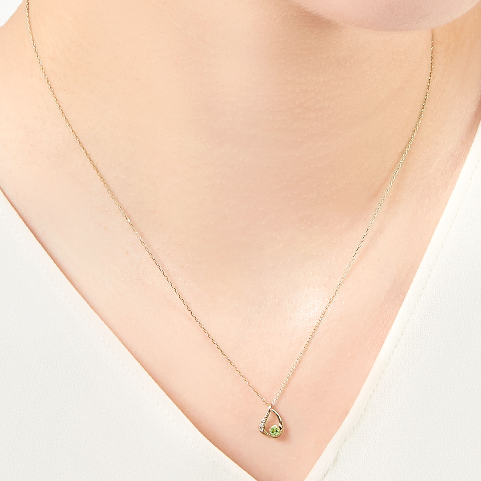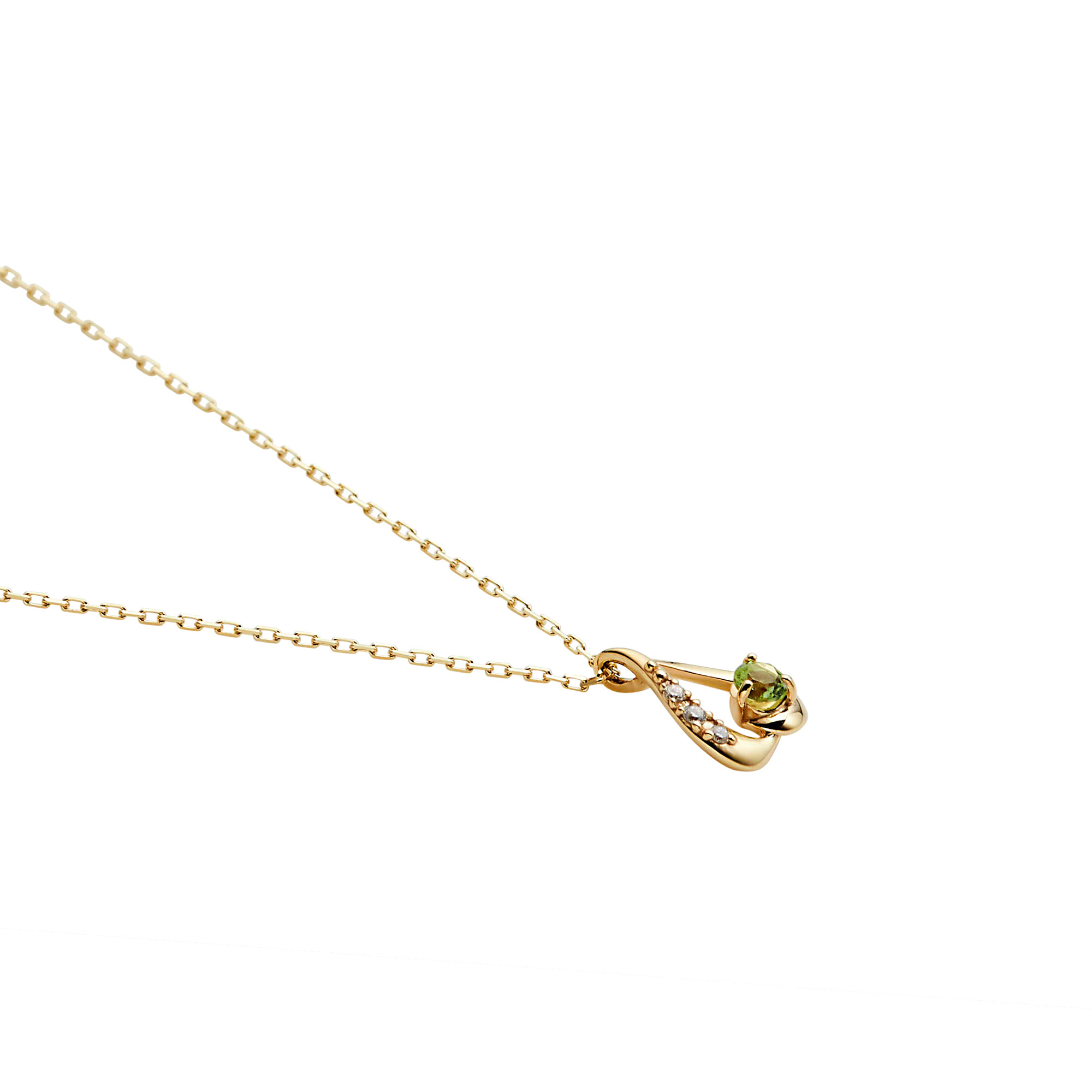 艶やかなイエローゴールドで描かれたドロップモチーフにさり気なくメレダイヤが輝くカラーストーンネックレスです。