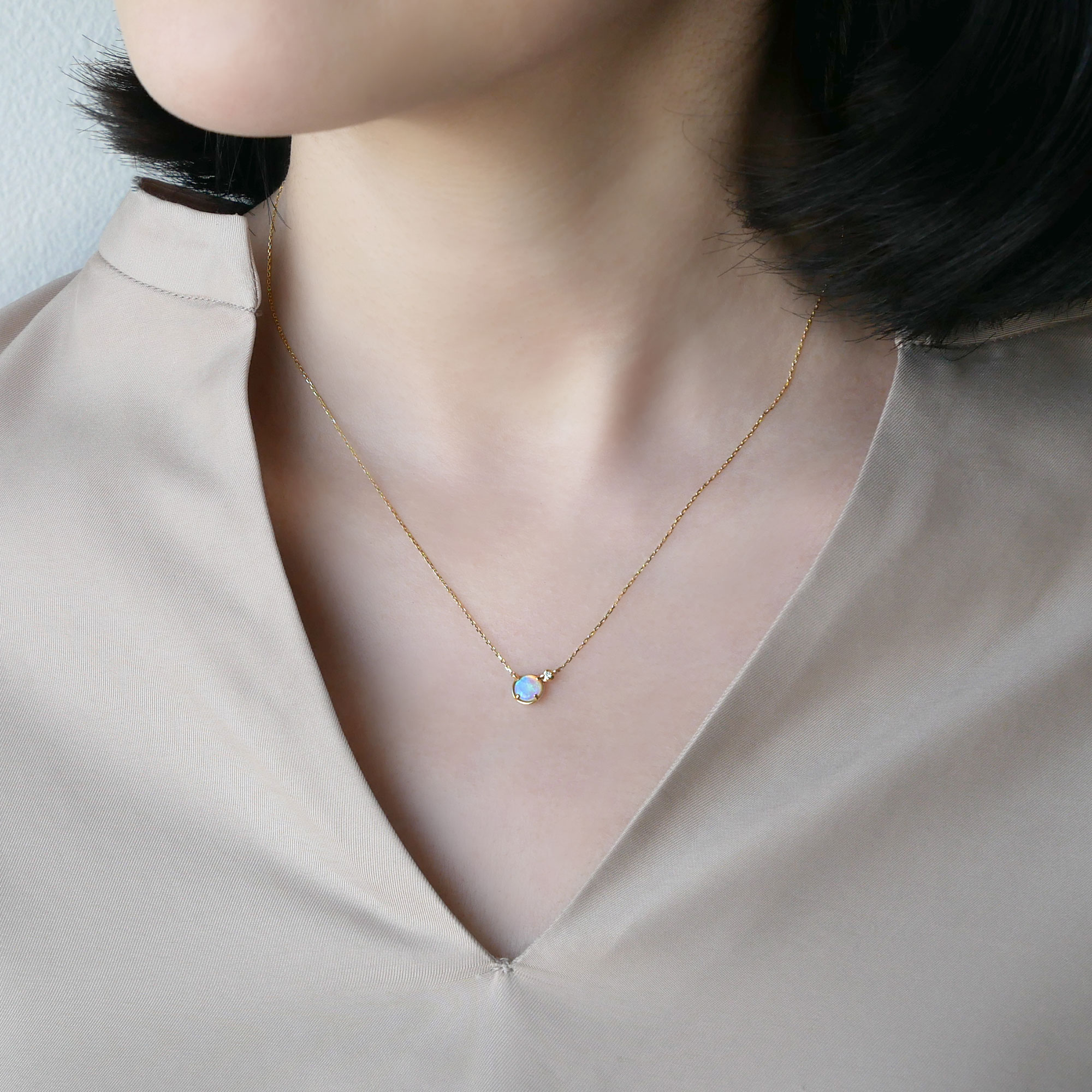 見る角度によって様々に色を変えるオパールが神秘的な魅力を放つネックレス。