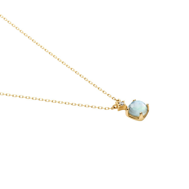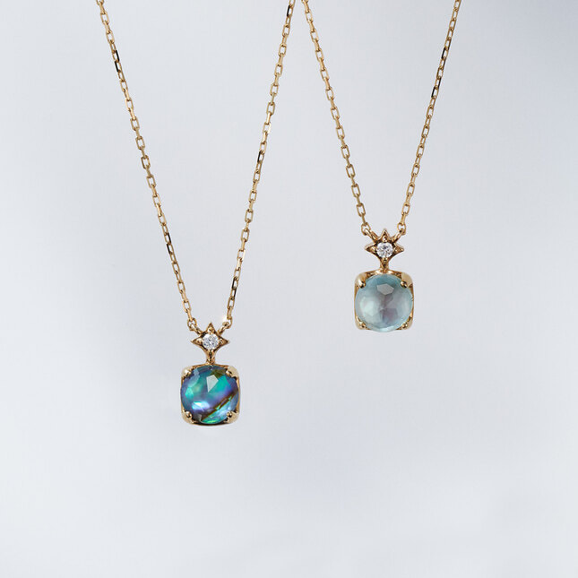 見る角度によってゆらめくように変化する表情を、シェルとブルートパーズを重ね合わせることで表現。