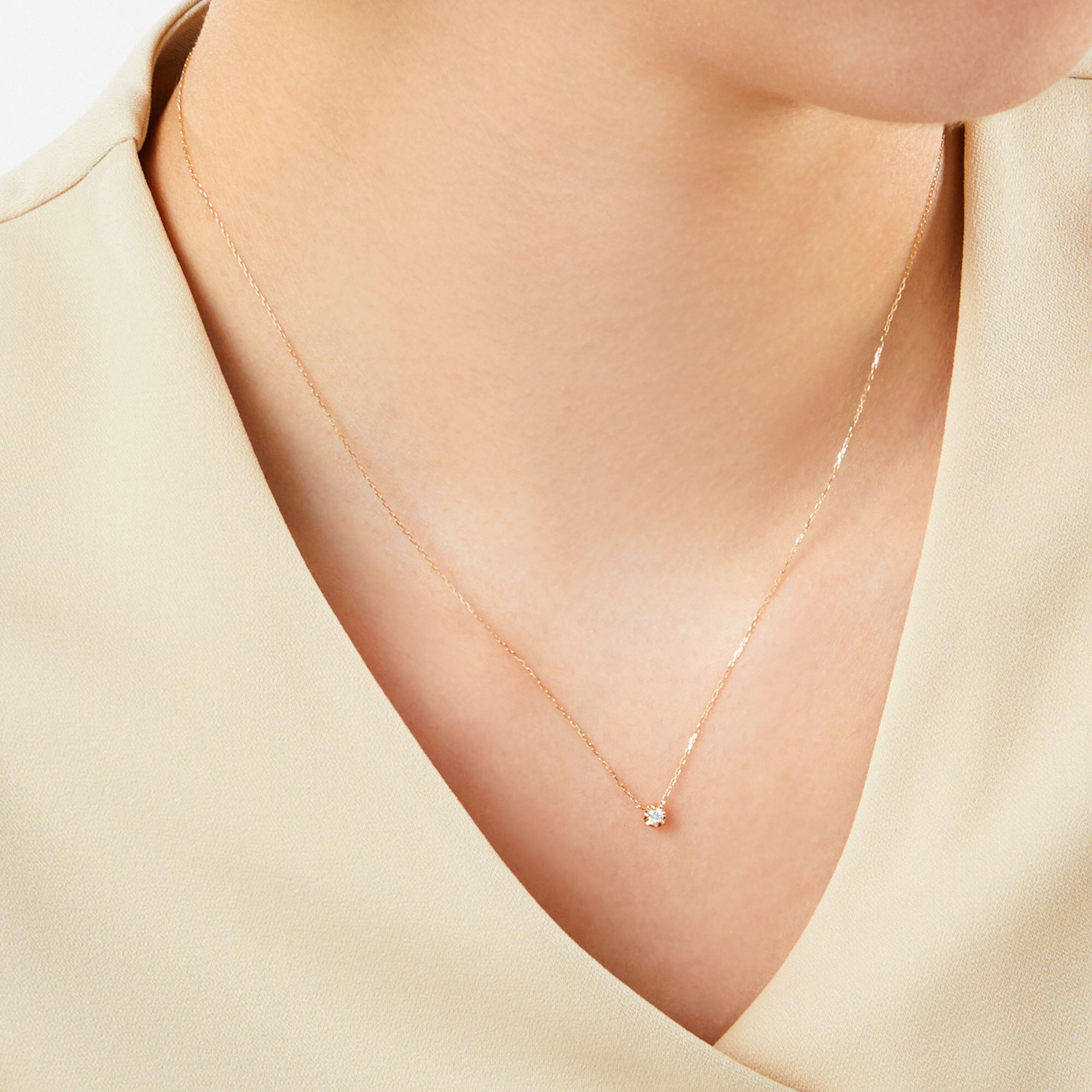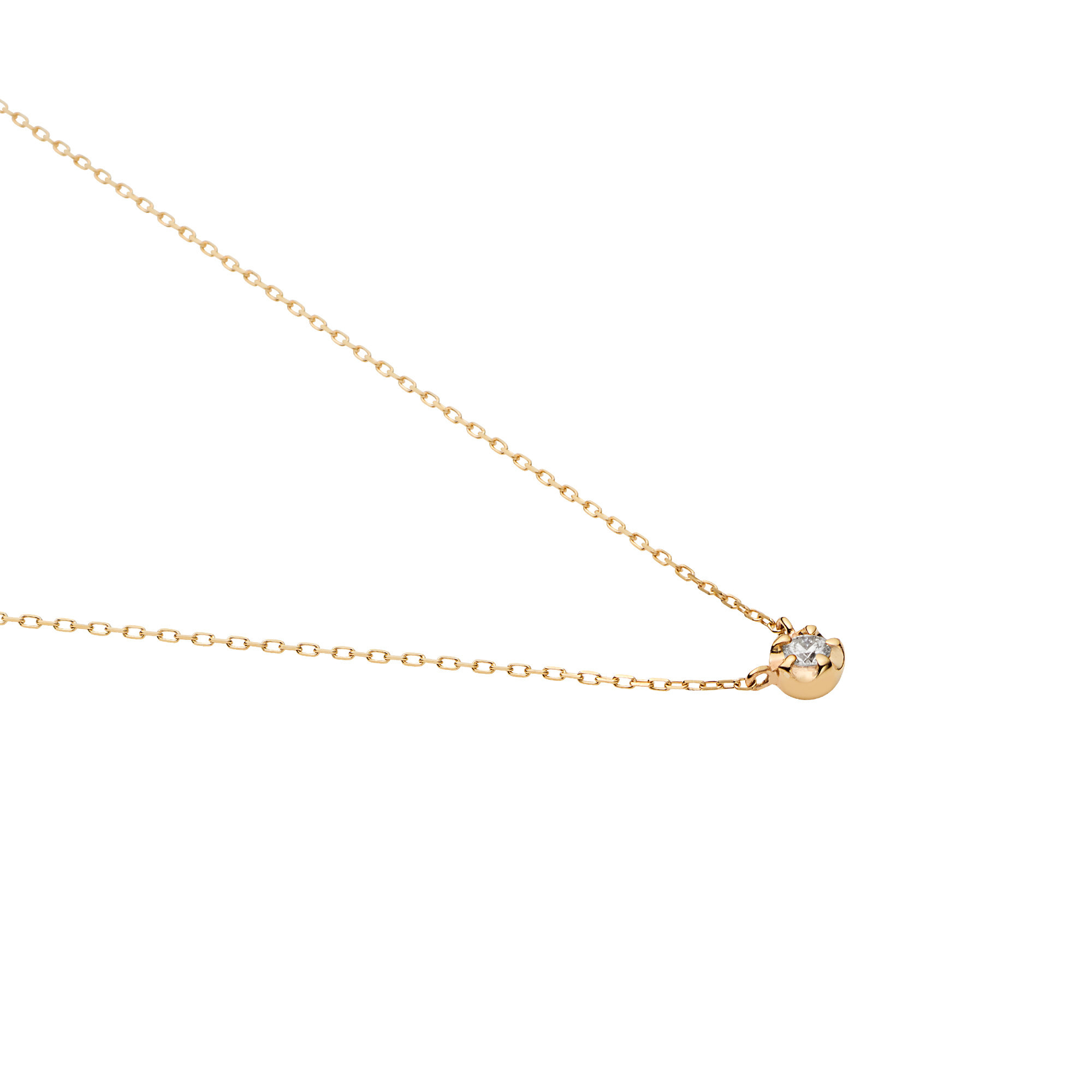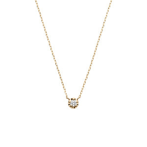 イエローゴールドのエレガントなきらめきで、一粒のダイヤモンドを縁取ったネックレス。