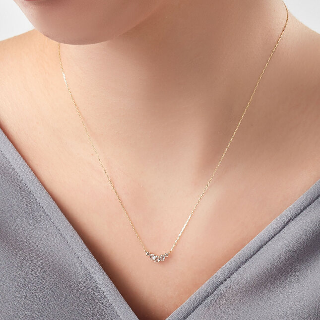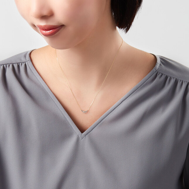 オーバルカットを横に並べたデザインが、少しクラシカルな雰囲気をまとわせながら胸元に上品な印象をプラス。