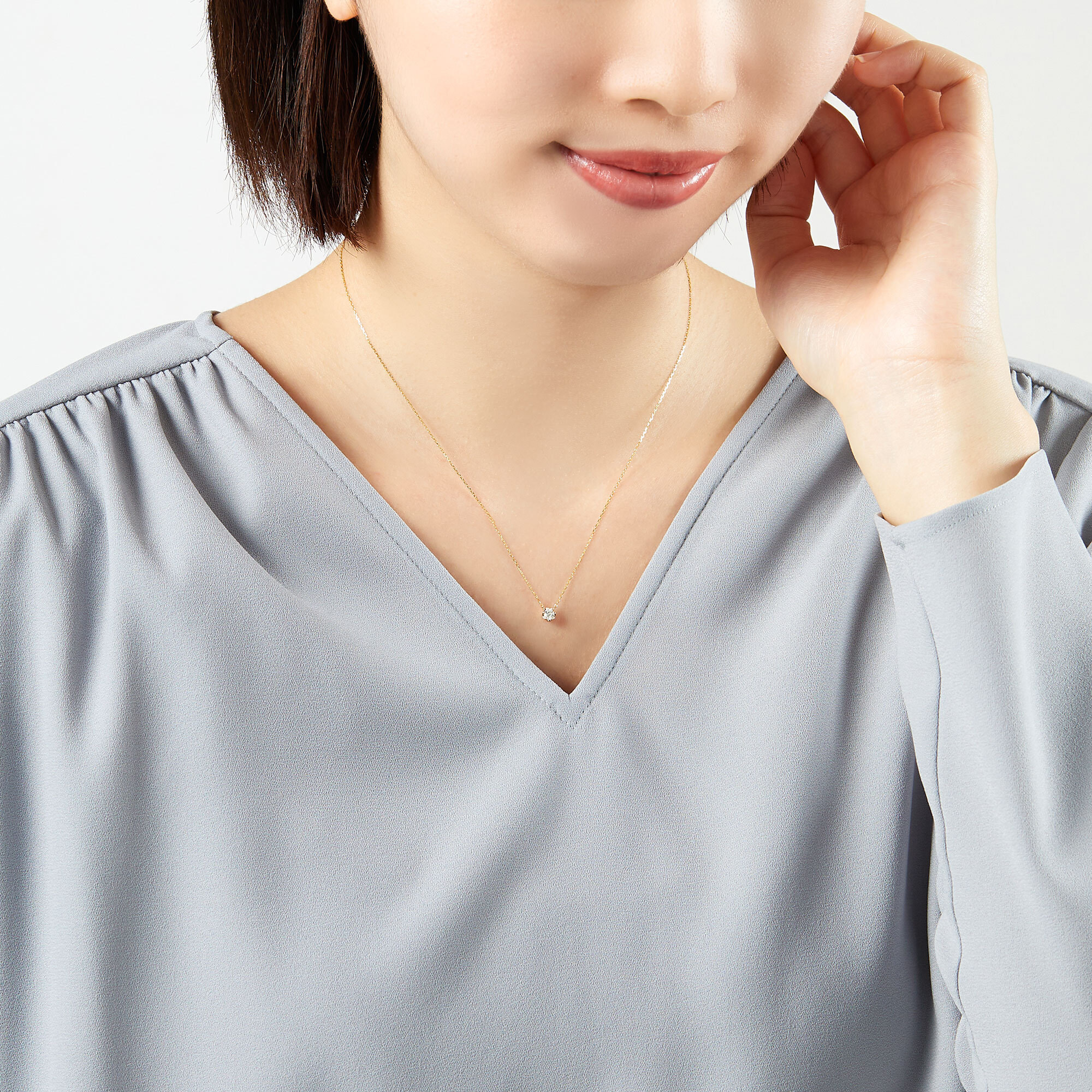 イエローゴールドのエレガントなきらめきで、一粒のダイヤモンドを縁取ったネックレス。