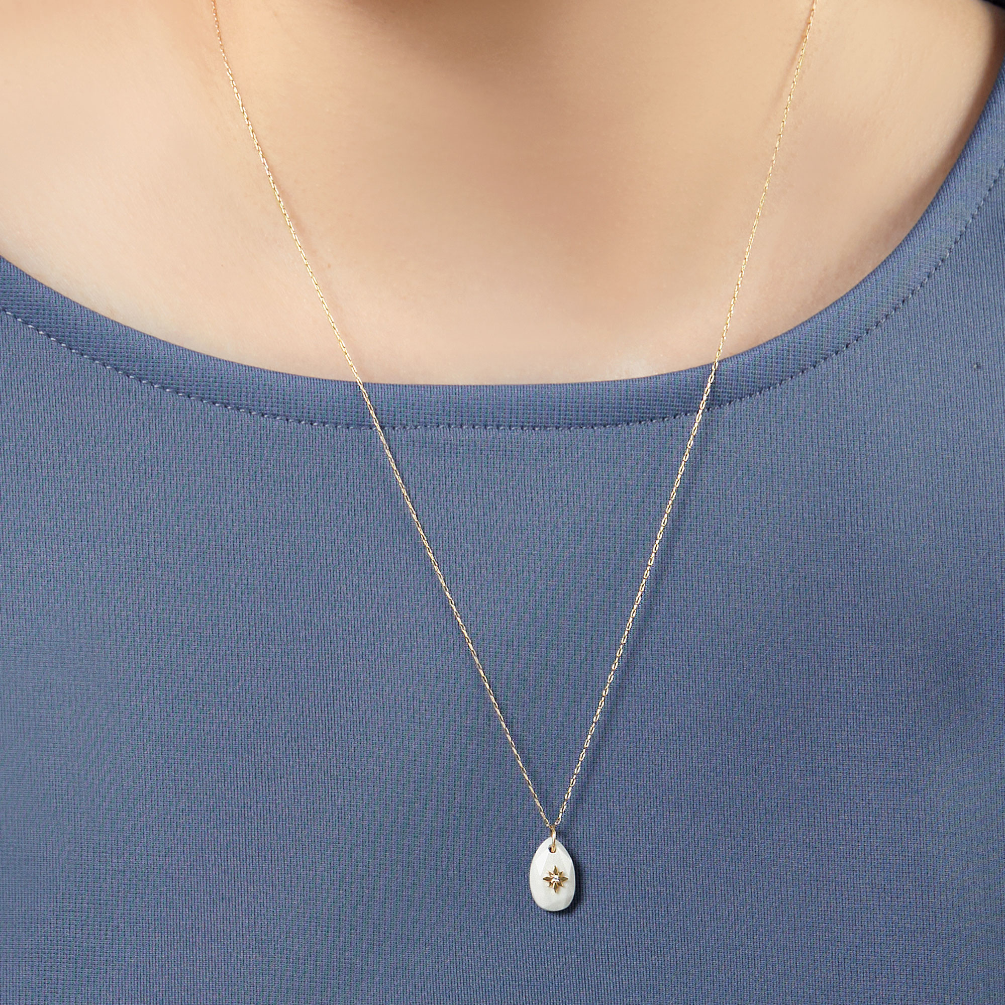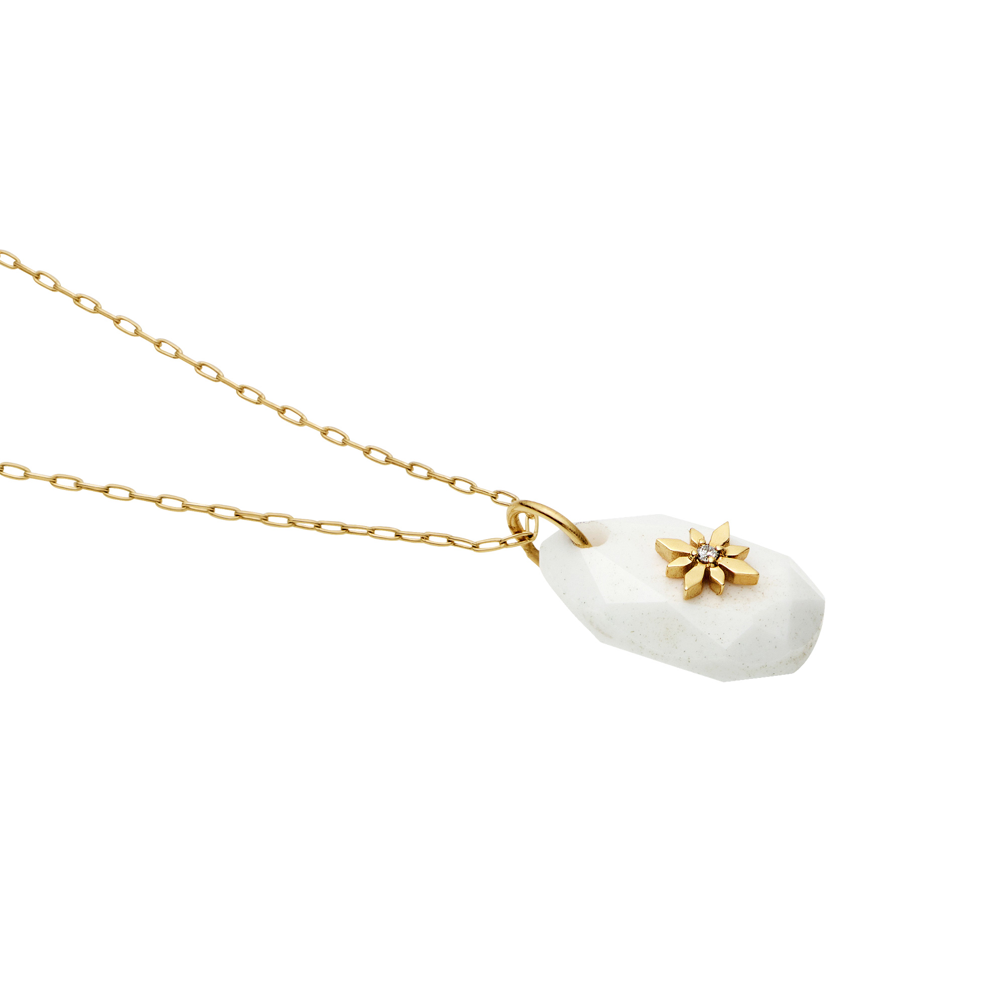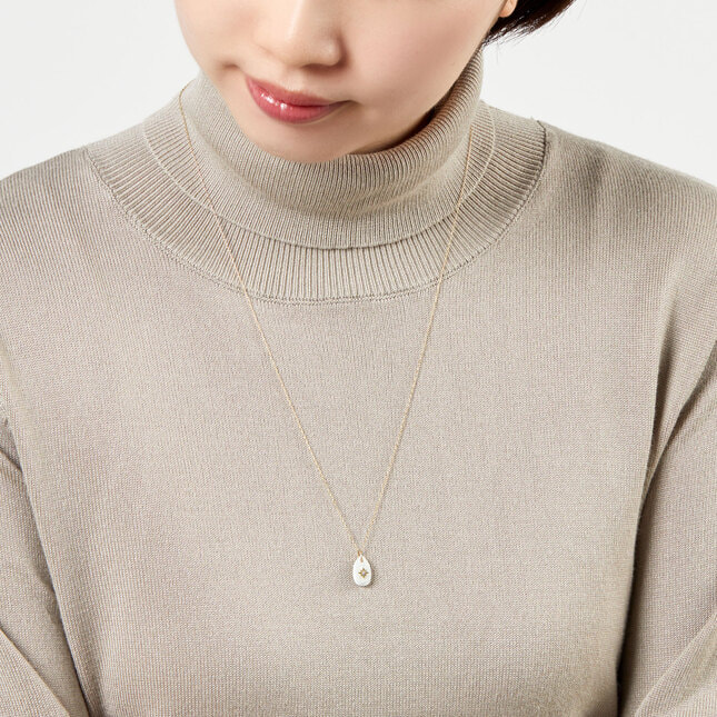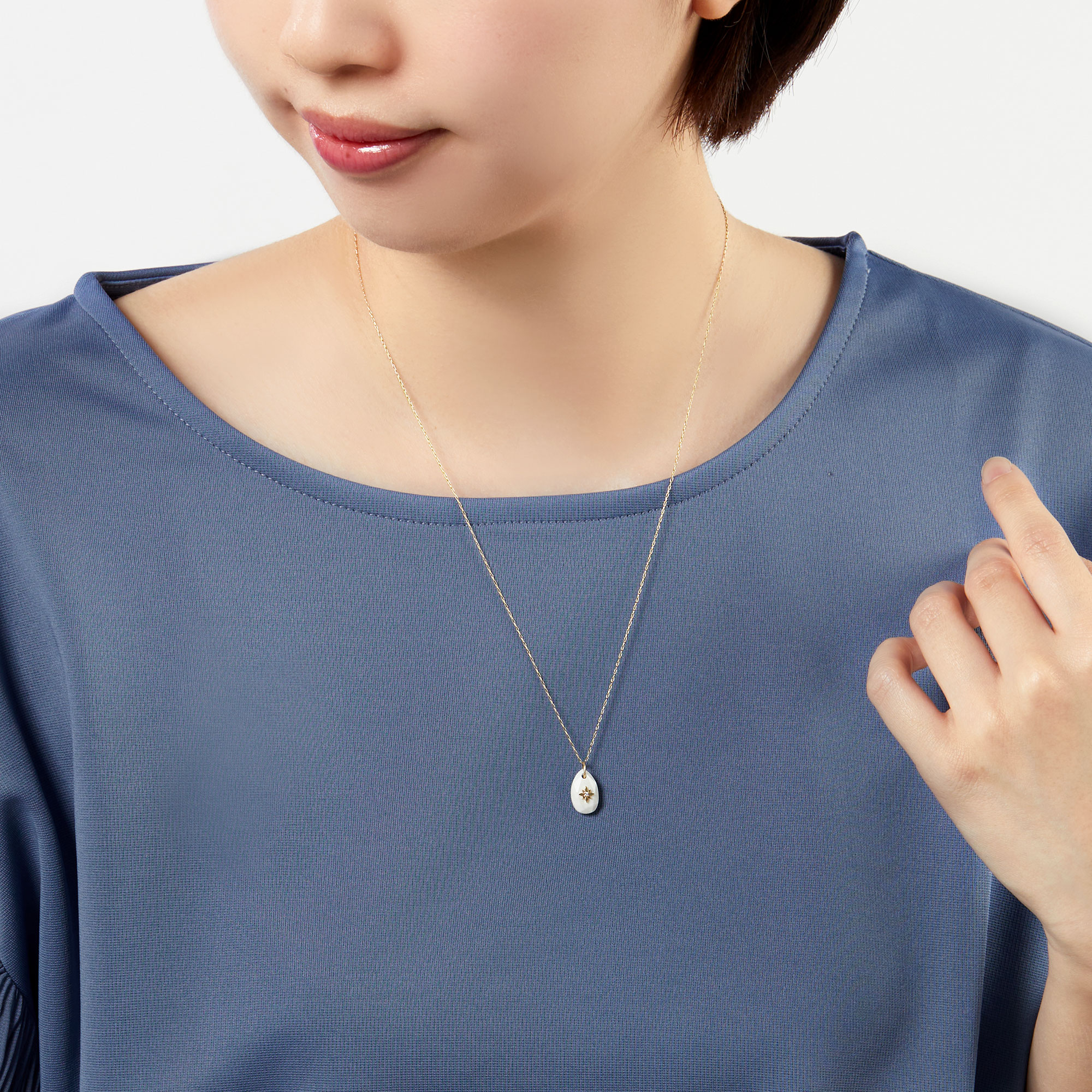 優しく光る乳白色のホワイトアゲートにゴールドの花をあしらったネックレス。