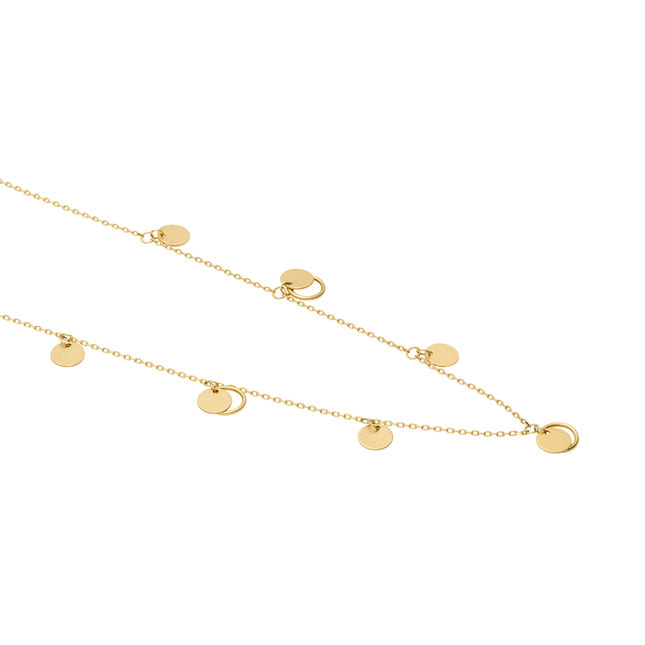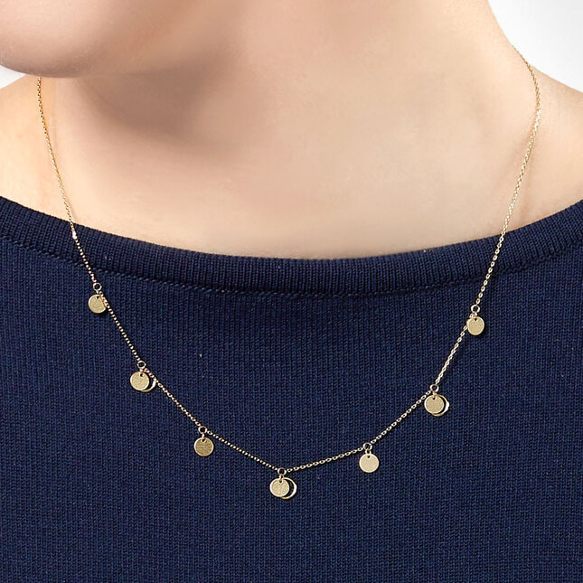 チェーンの繊細なきらめきに丸いプレートが下がり、揺れるたびにゴールドの陰影が表情を与えます。