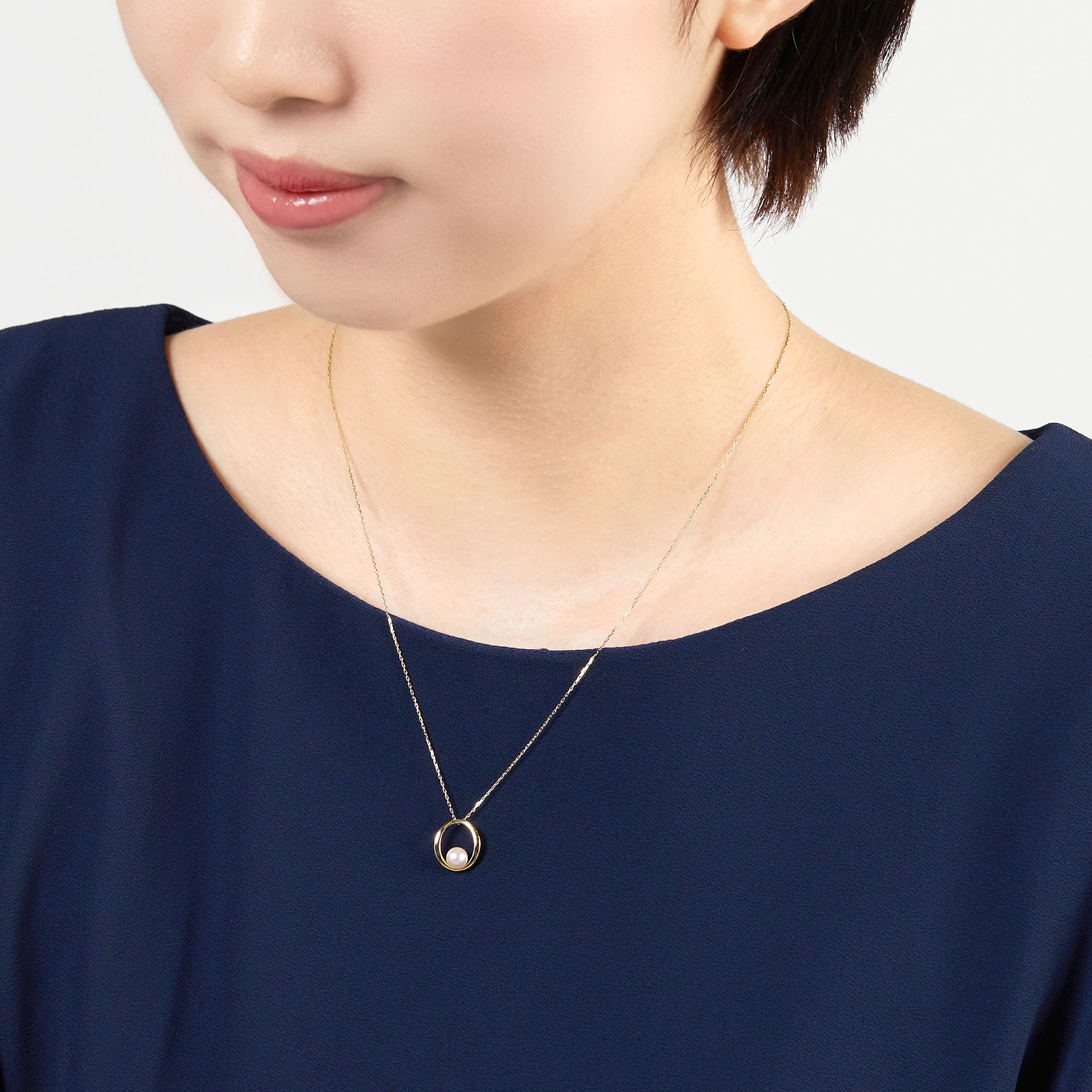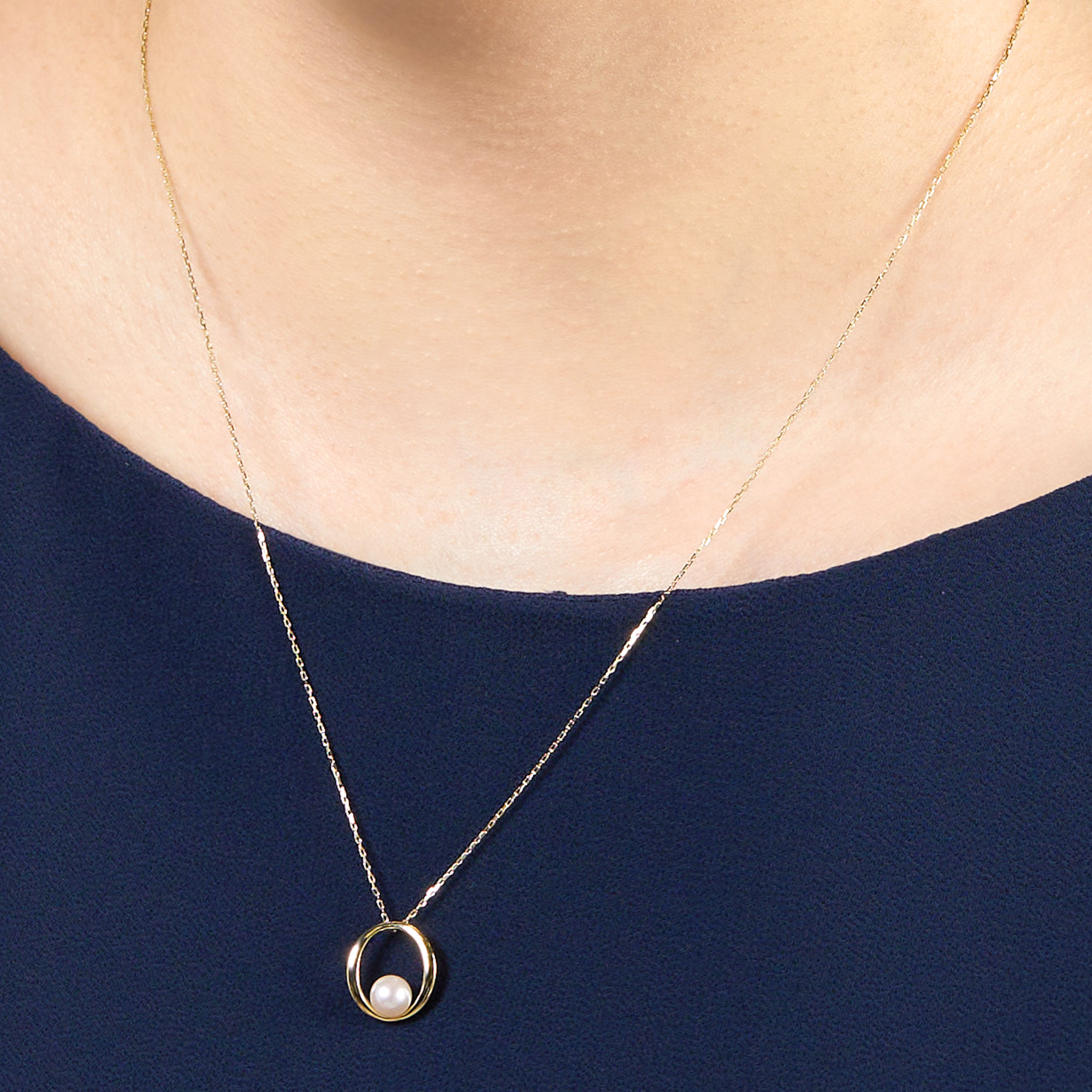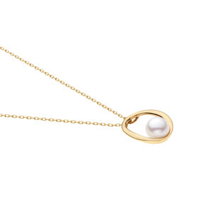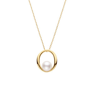 オーバル型のイエローゴールドのフレームに、一粒のアコヤパールをあしらったネックレス。
