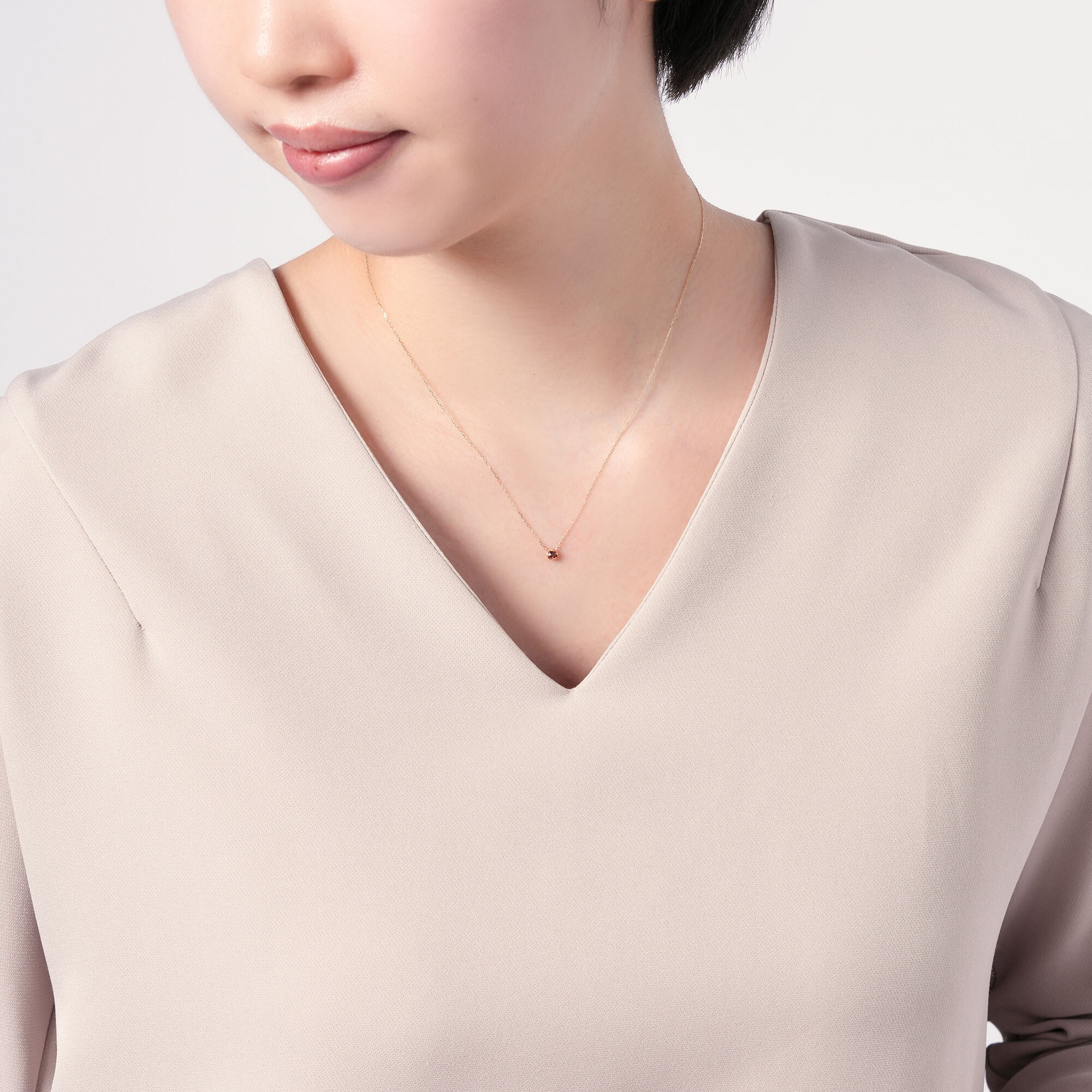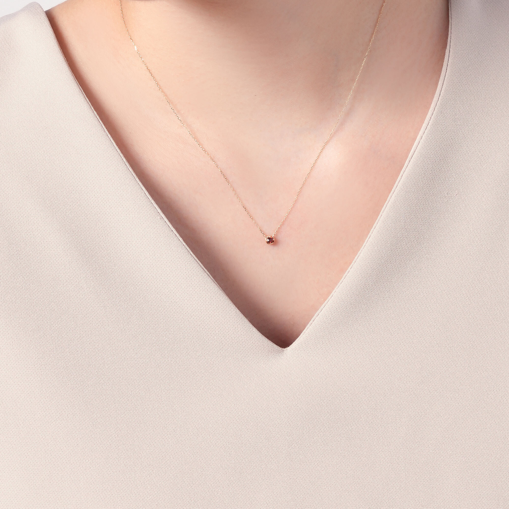 落ち着いた深い色合いのガーネットをイエローゴールドで取り巻いた、さりげなくエレガントなデザインのネックレス。