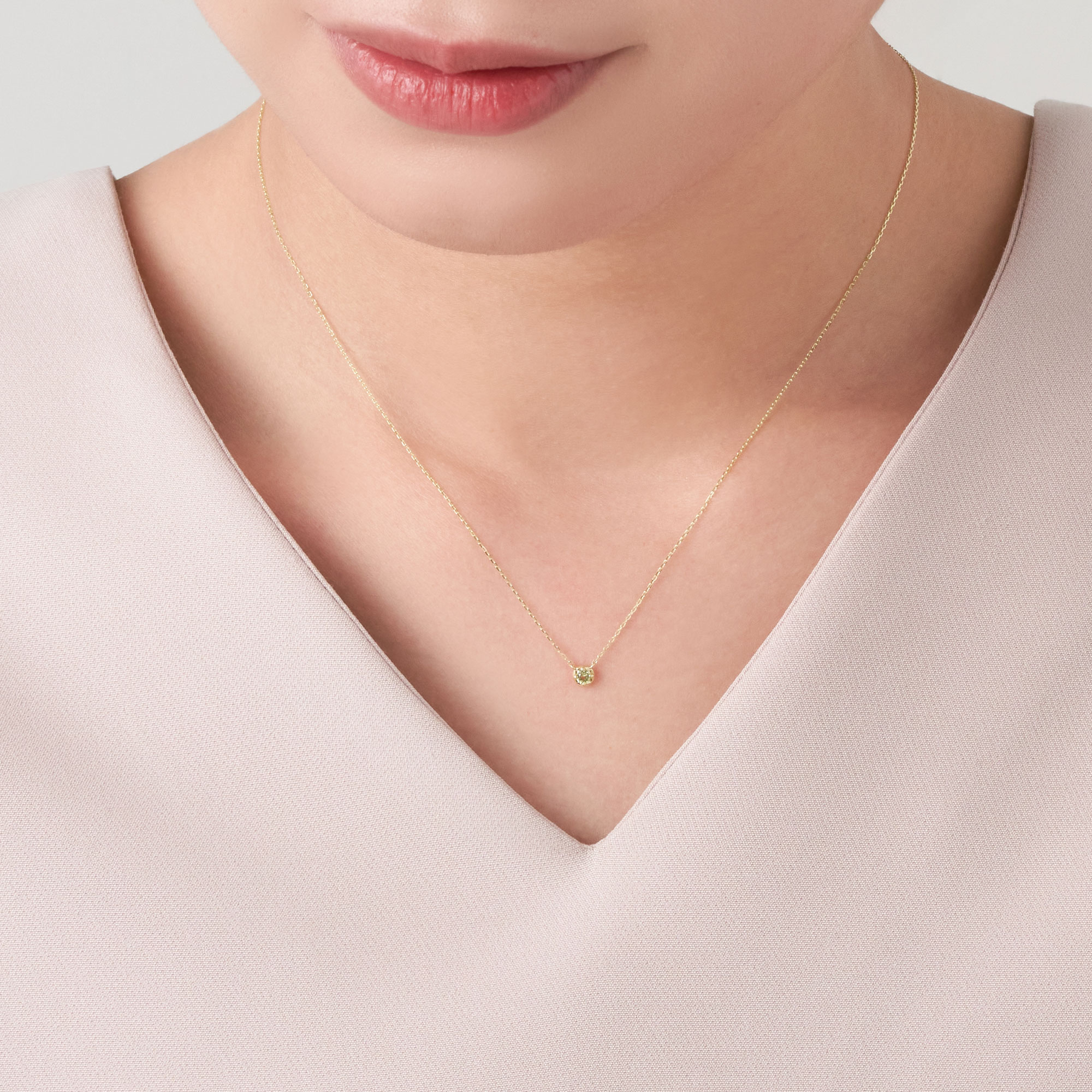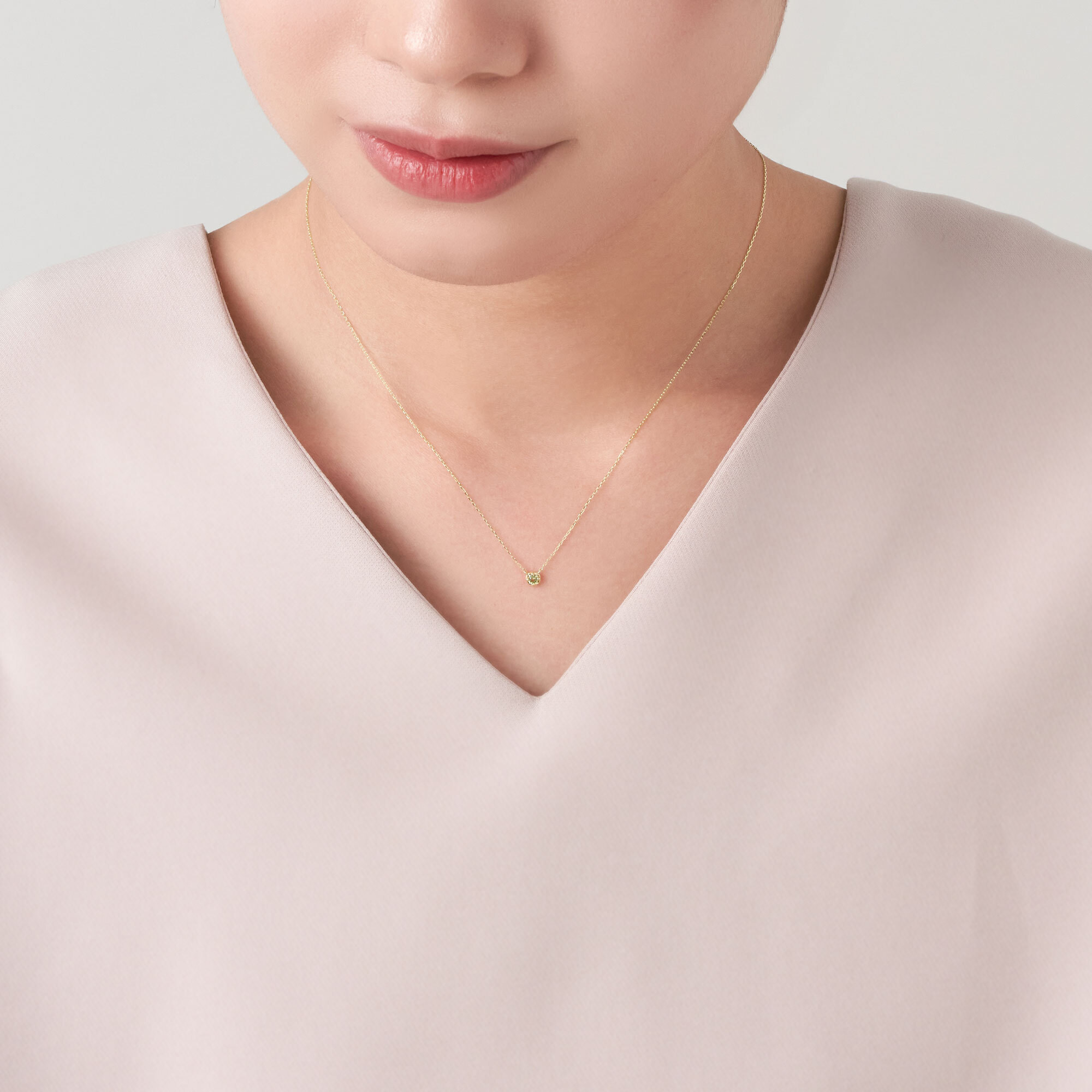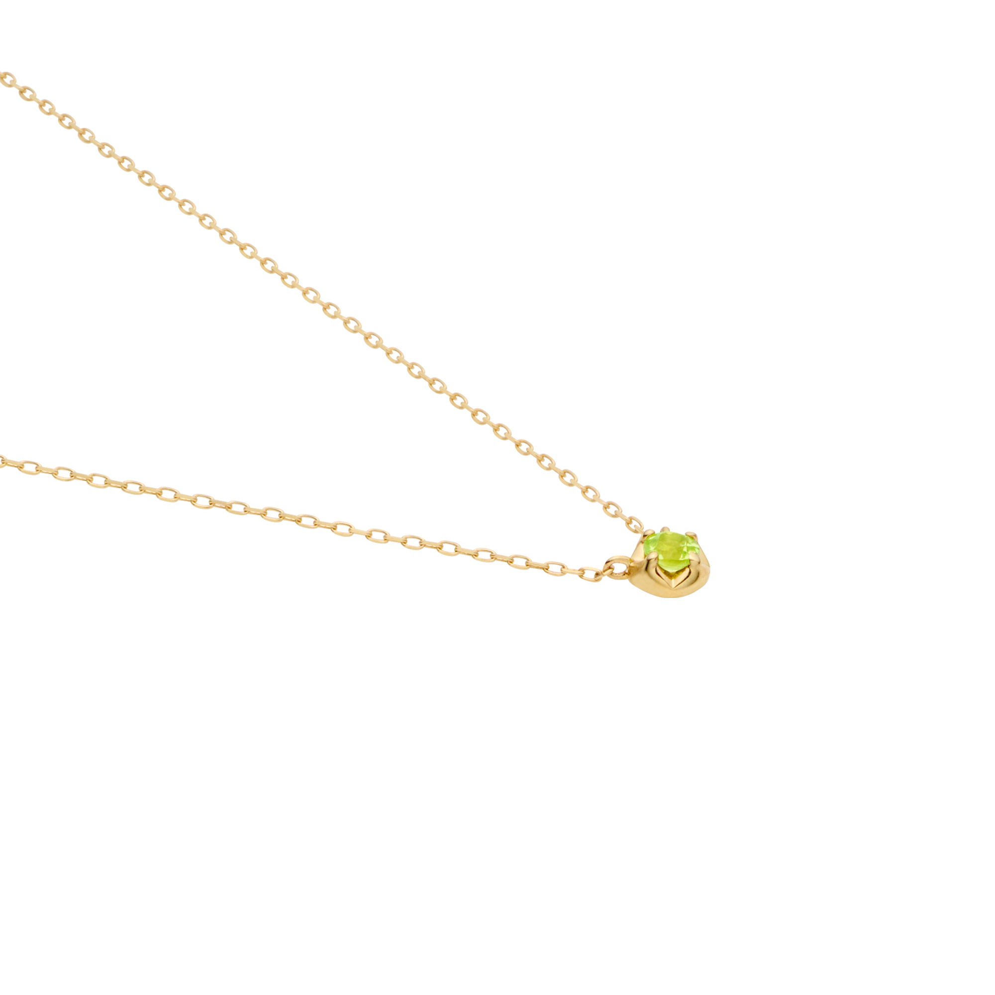 明るい黄緑色が美しいペリドットをイエローゴールドで取り巻いた、さりげなくエレガントなデザインのネックレス。