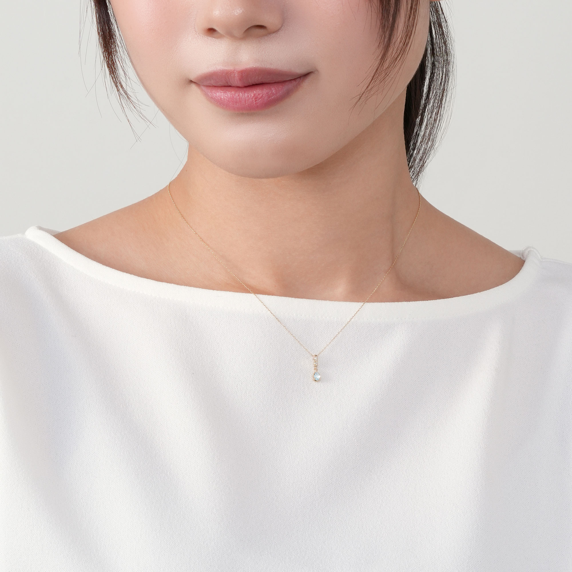 アクアマリンの優しい光が、胸元にハッピーでみずみずしい輝きをまとわせてくれます。
