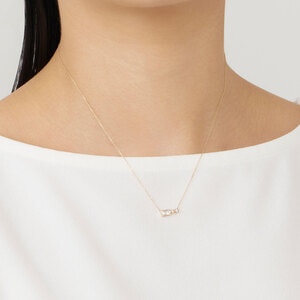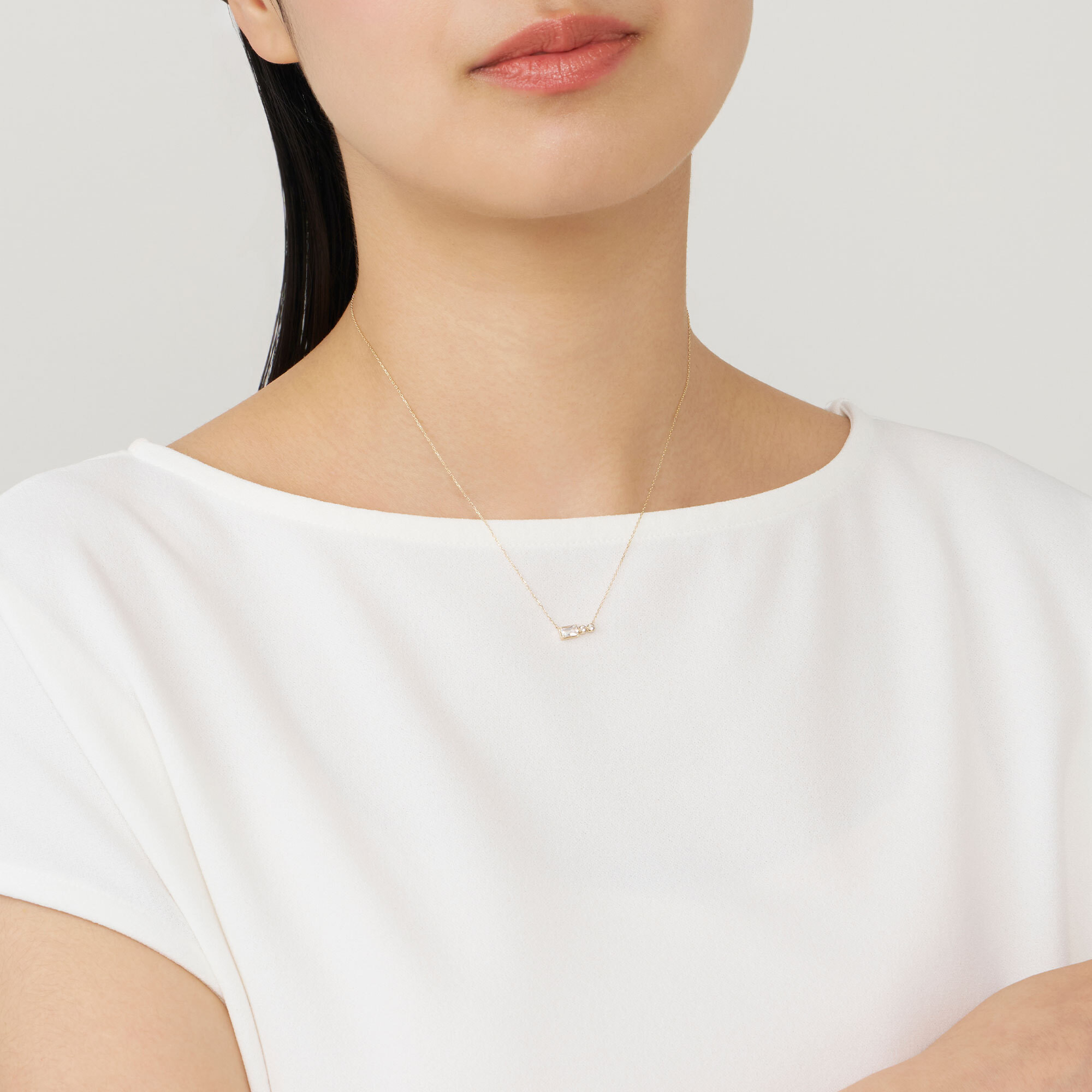二つを合わせることでリズム感のある輝きを胸元にまとわせ、わずかにのぞくイエローゴールドが、透明感に温かみと明るさをもたらします。
