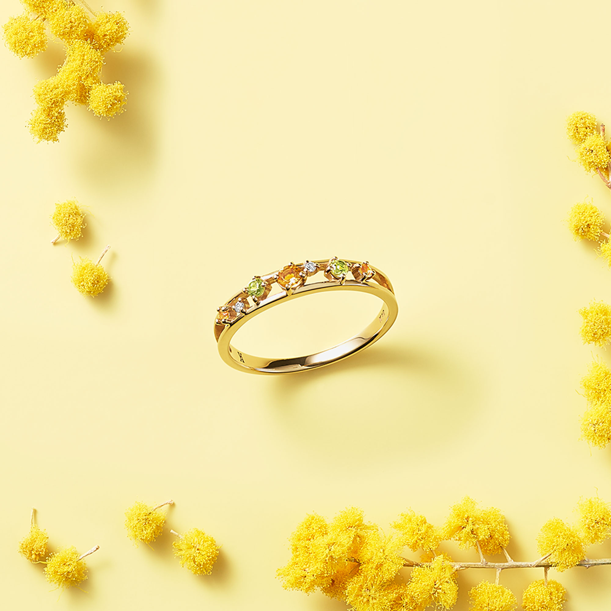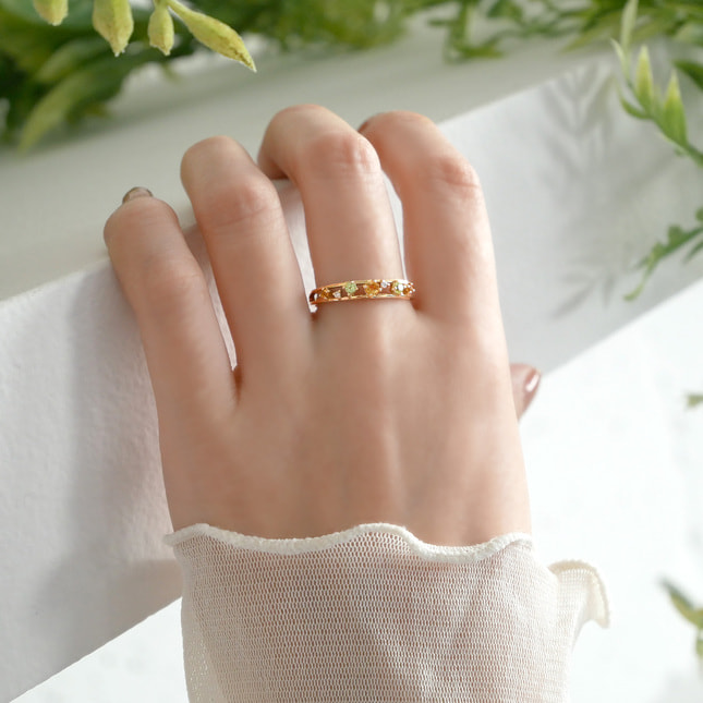 ペリドットの爽やかなグリーンと鮮やかなオレンジのシトリンにダイヤモンドの輝きを合わせた、華やかな色合いのリング。