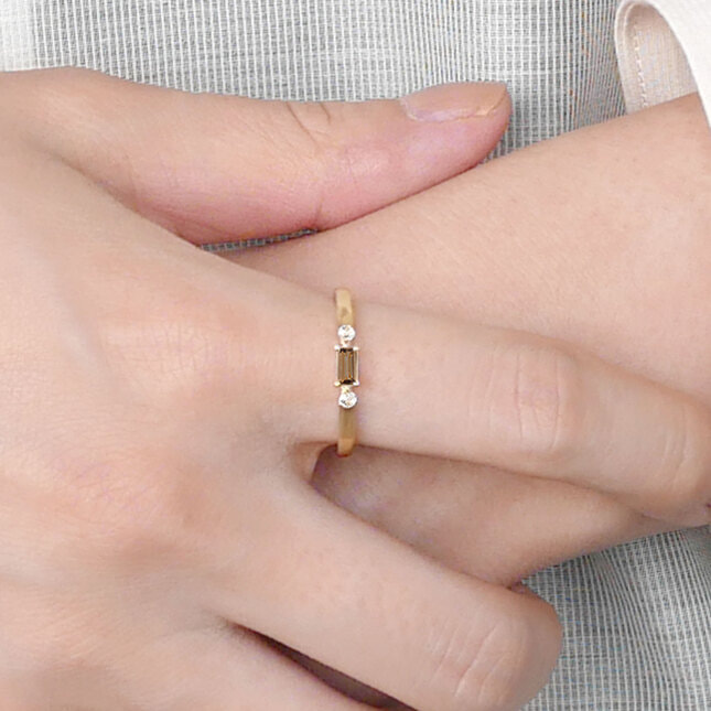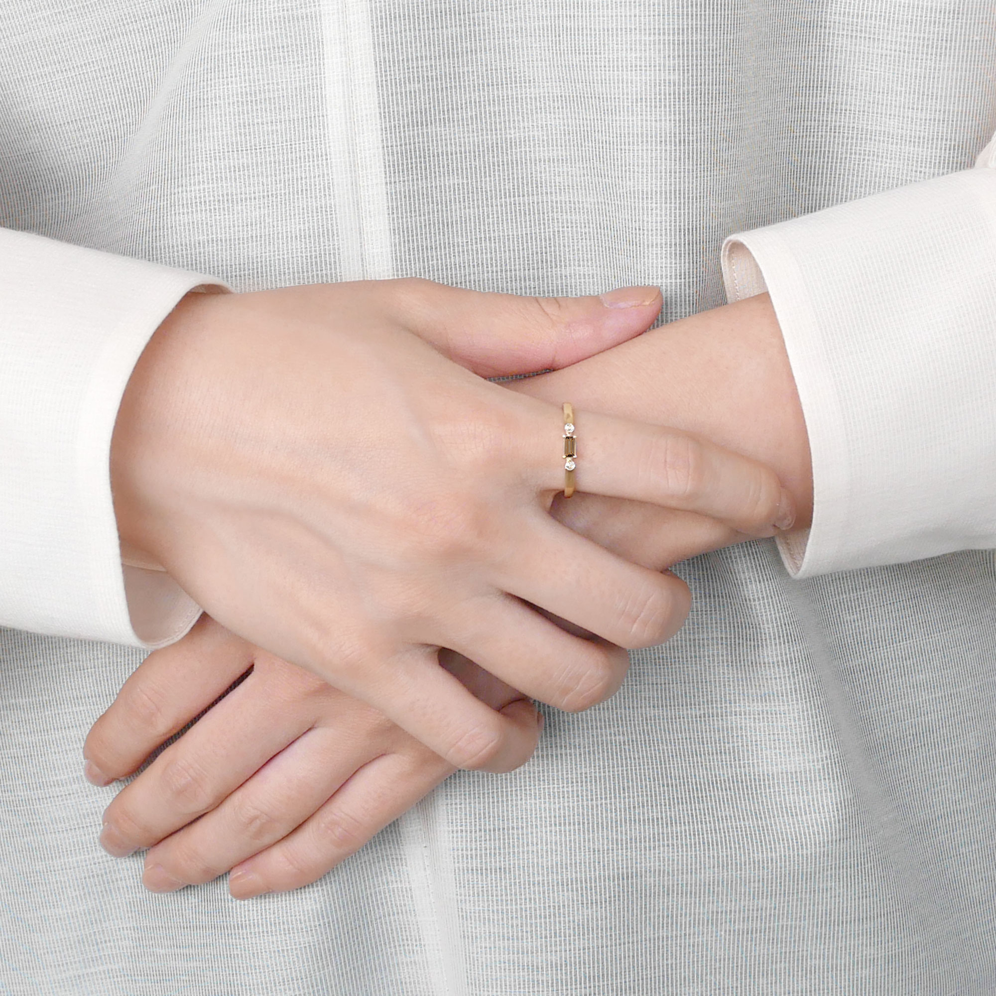 バケットカットを施したスモーキークォーツが印象的なリング。