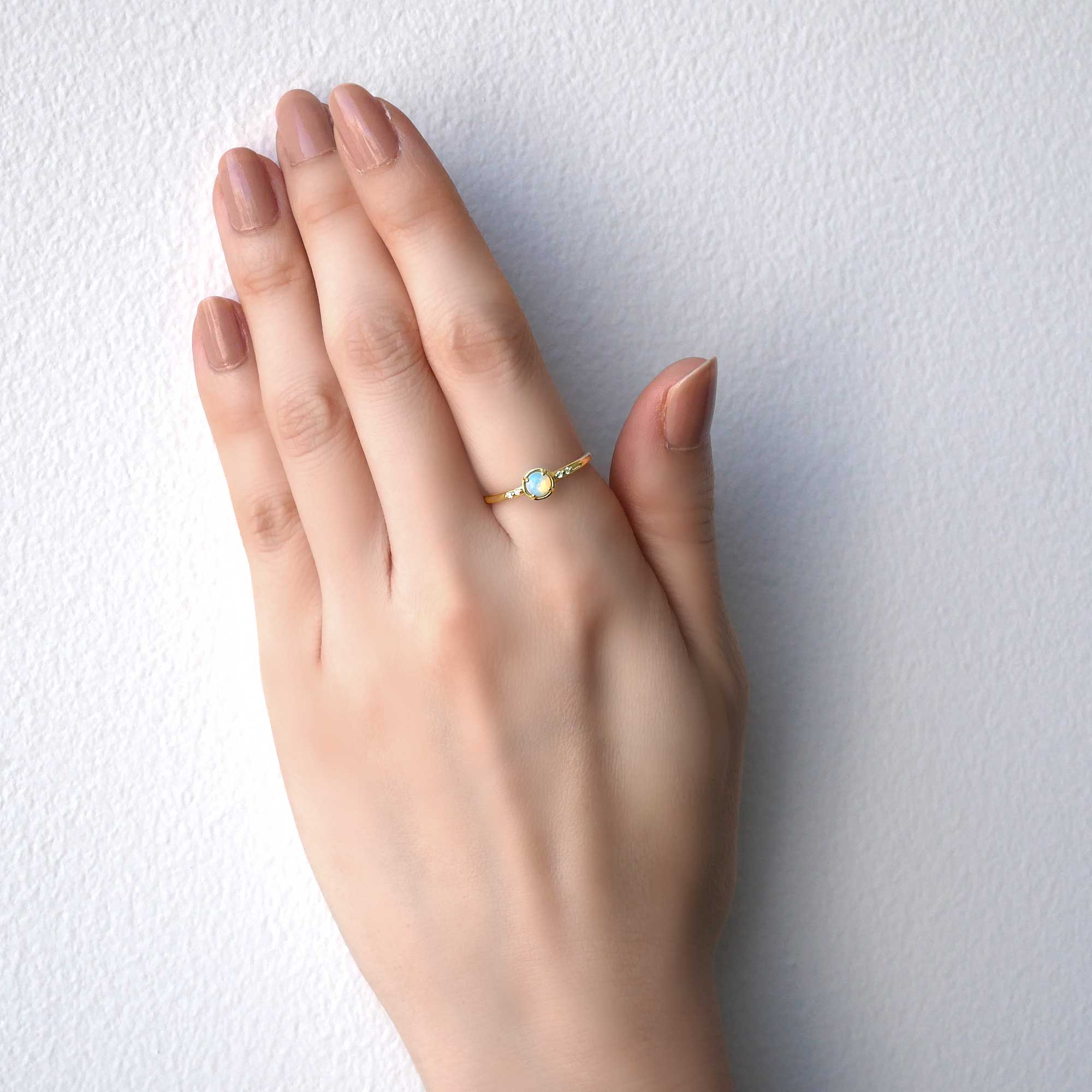 見る角度によって様々に色を変えるオパールが神秘的な魅力を放つリング。