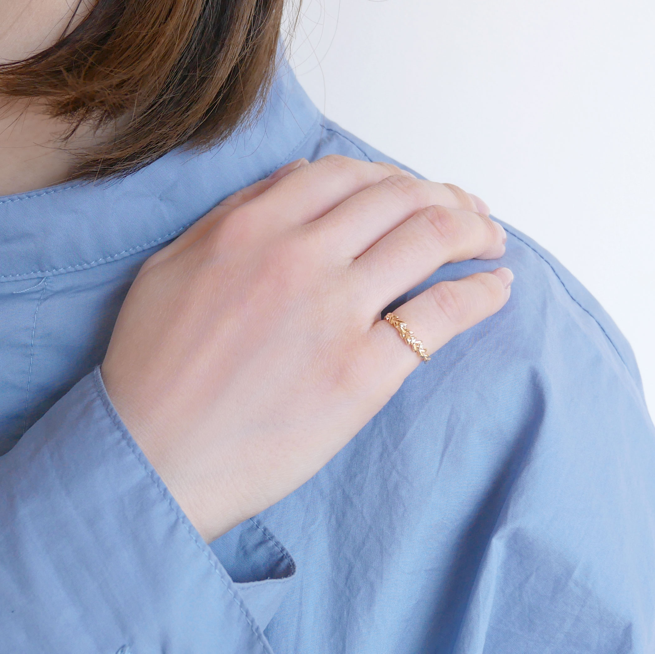 風に揺らぐゴールドの葉と瑞々しく輝くダイヤモンドのピンキーリング。