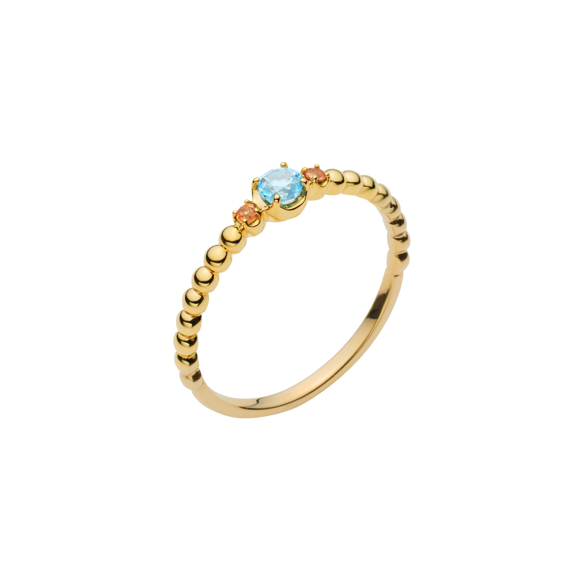 ブルートパーズとオレンジサファイアの輝きが、手元に印象的なきらめきをもたらすリング。