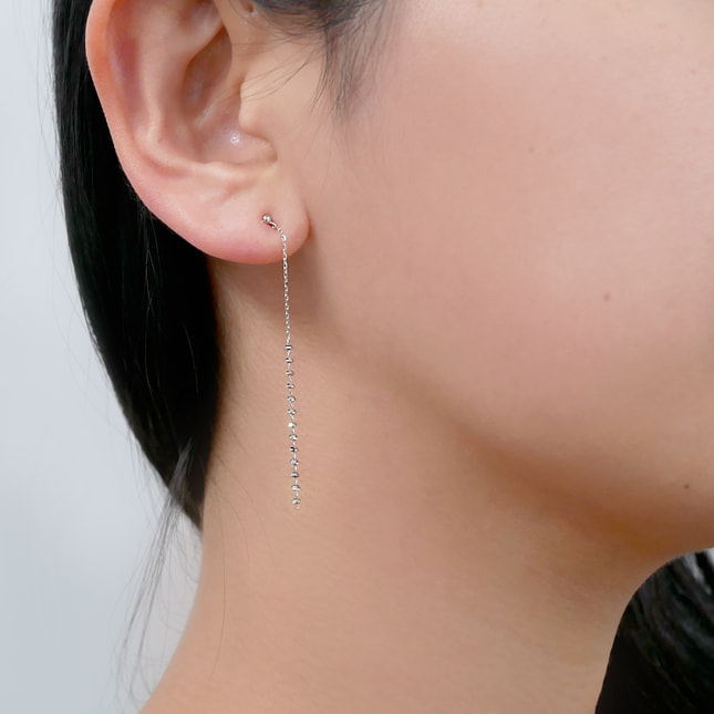 揺れるチェーンにプラチナの繊細なパーツがあしらわれ、煌めく光がお顔まわりをパッと明るくしてくれるピアスです。