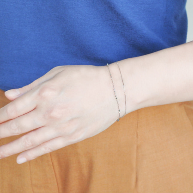 プラチナチェーンの煌めきが手元を女性らしく見せてくれるブレスレット。