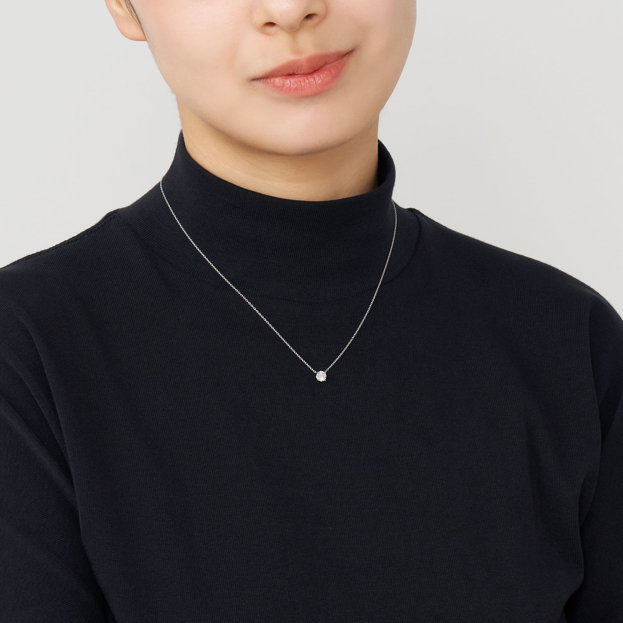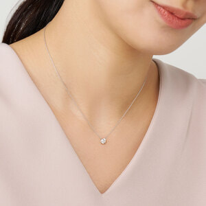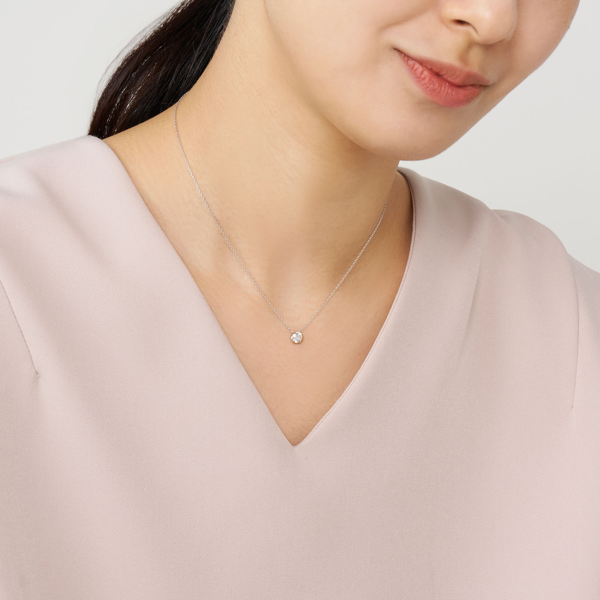 チェーンはダイヤモンドだけが胸元に可憐に浮かび上がる、華奢で控えめなアズキチェーンを使用。