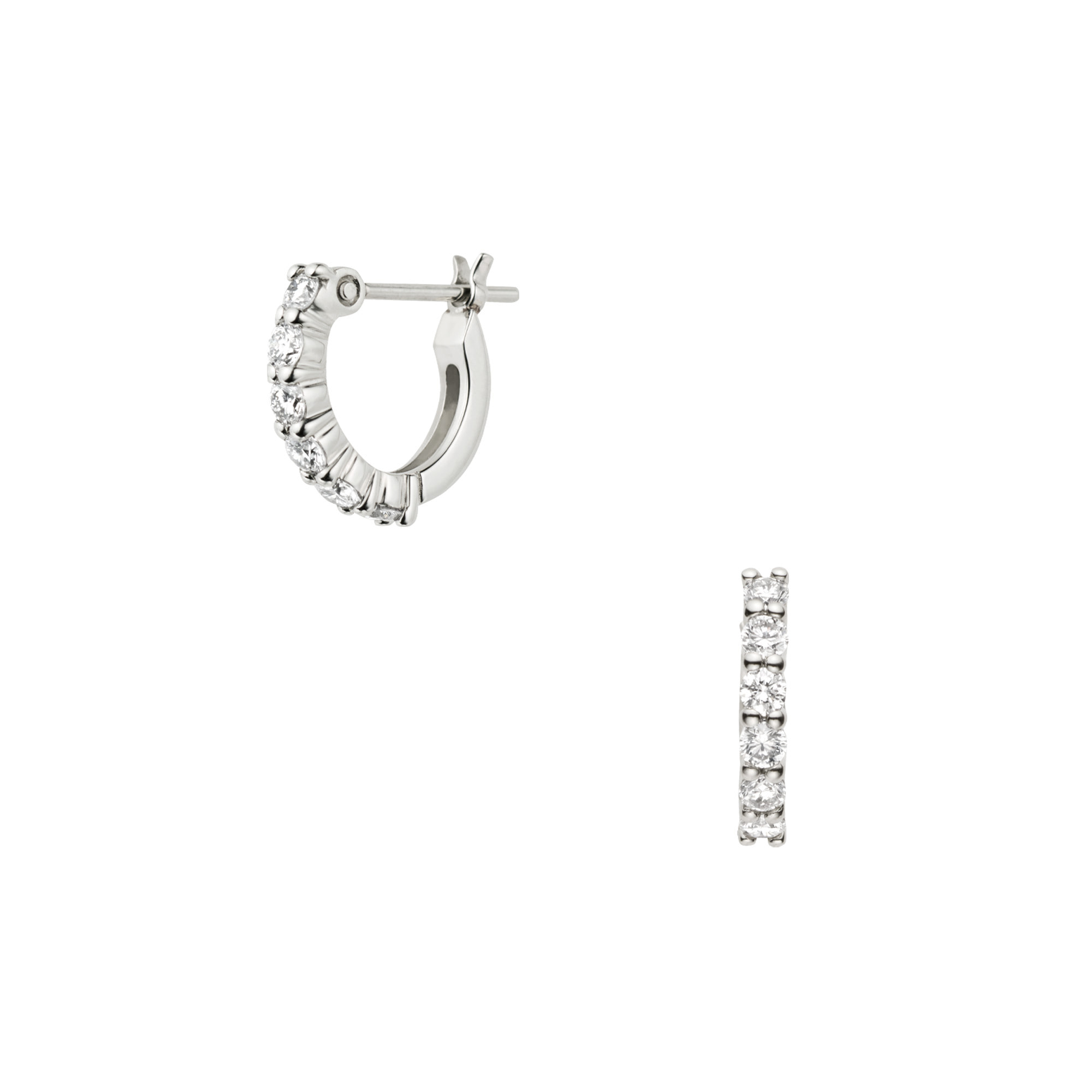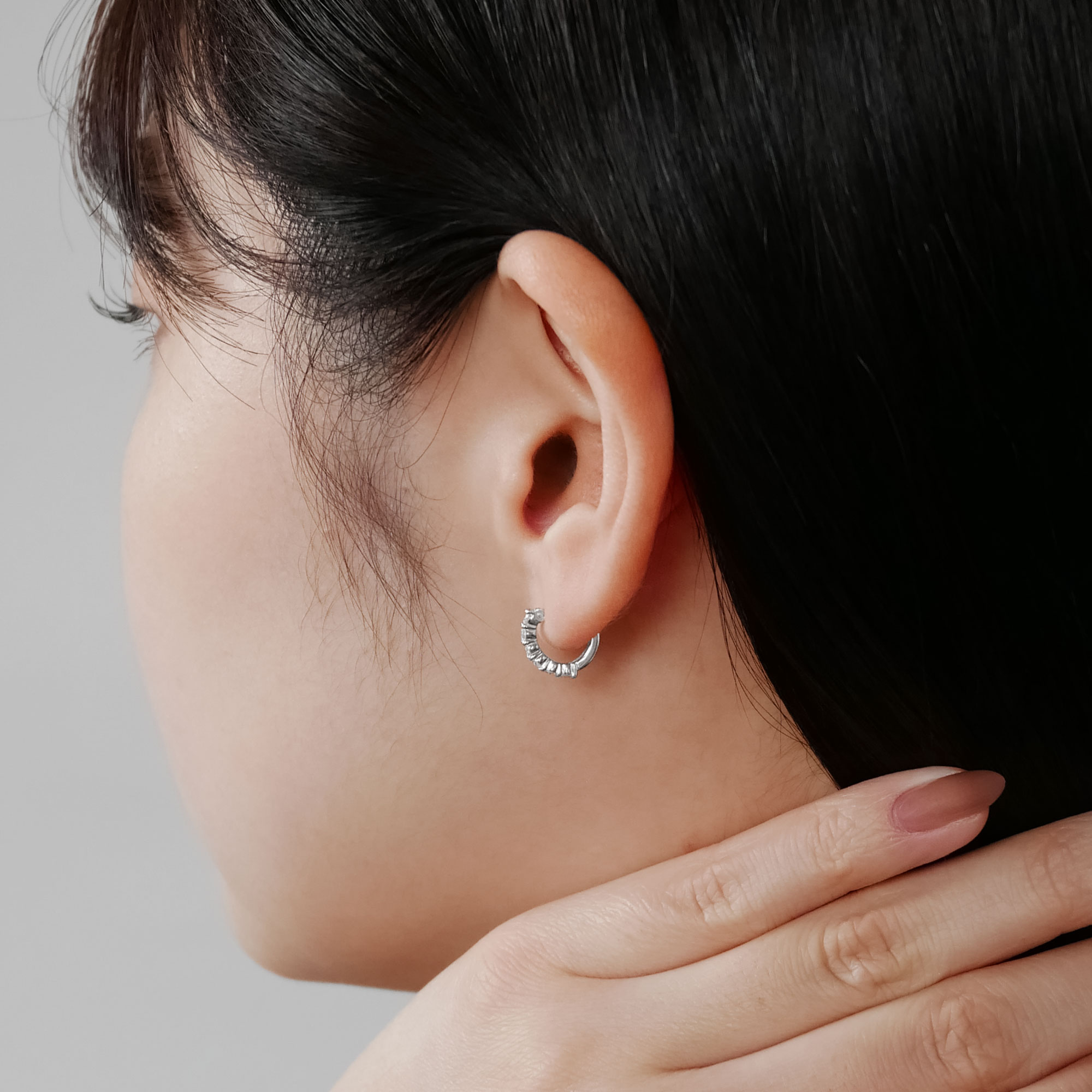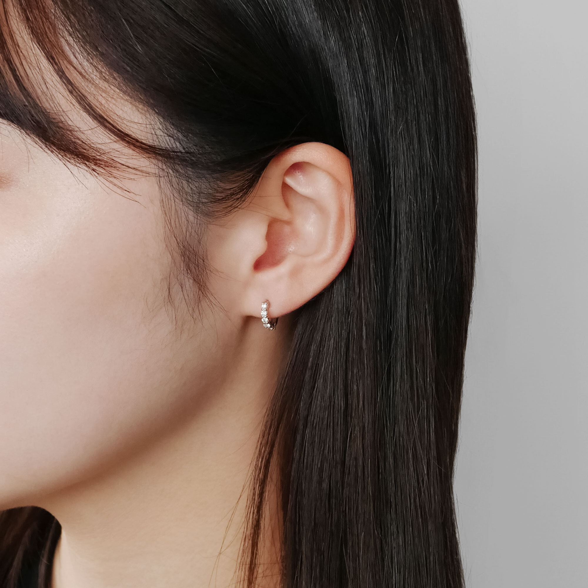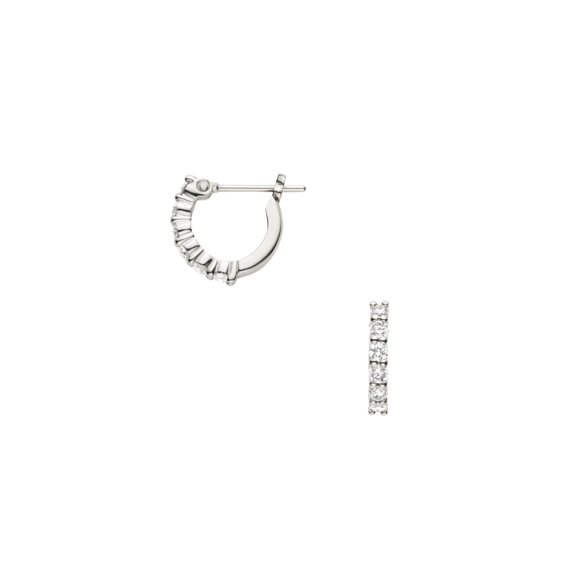 共有爪でセッティングしたダイヤモンドの輝きが美しい、シンプル&ベーシックなフープ型ピアス。