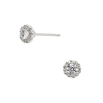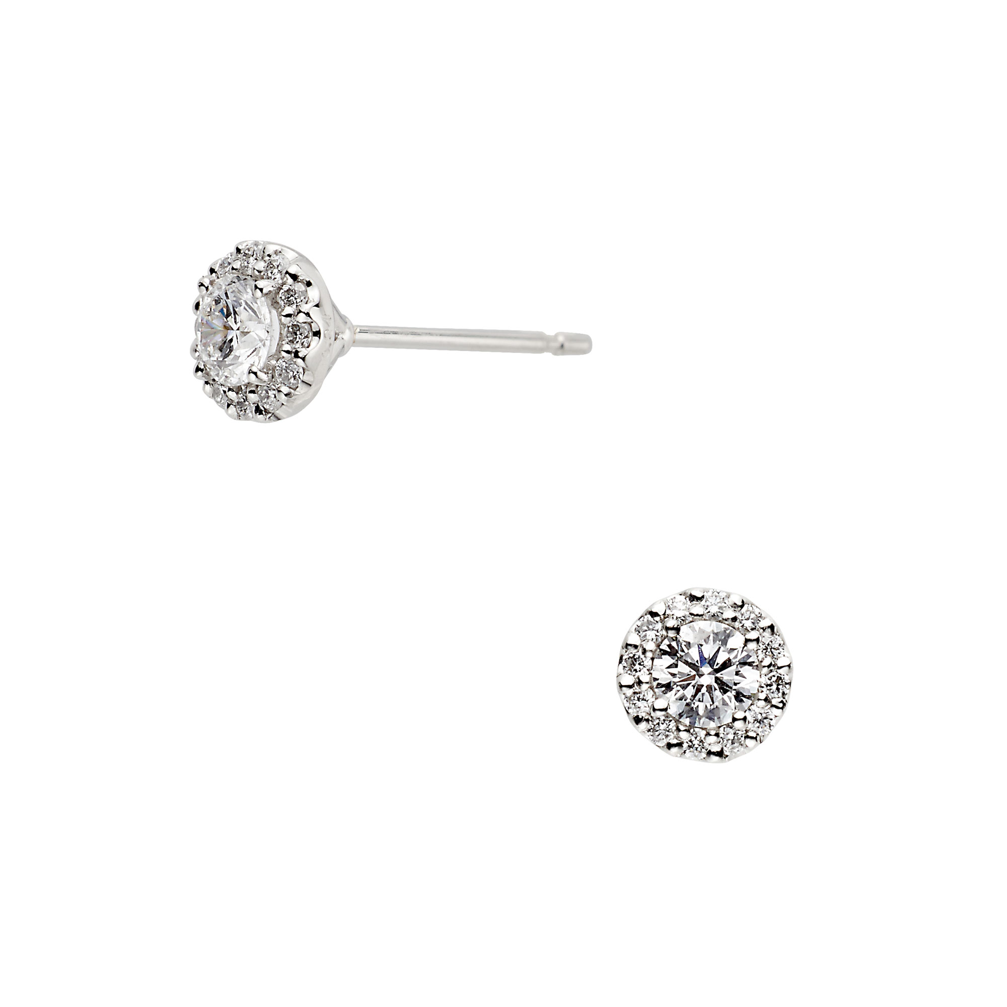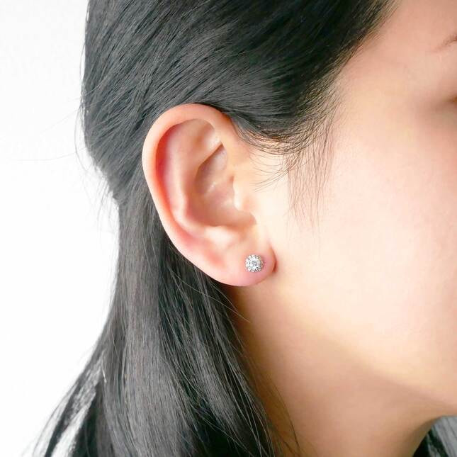 粒選りの一粒ダイヤモンドを繊細なメレダイヤモンドで縁取ったピアス。