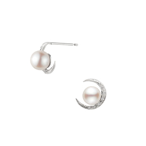プラチナの三日月にアコヤパールがそっと寄り添うピアス。