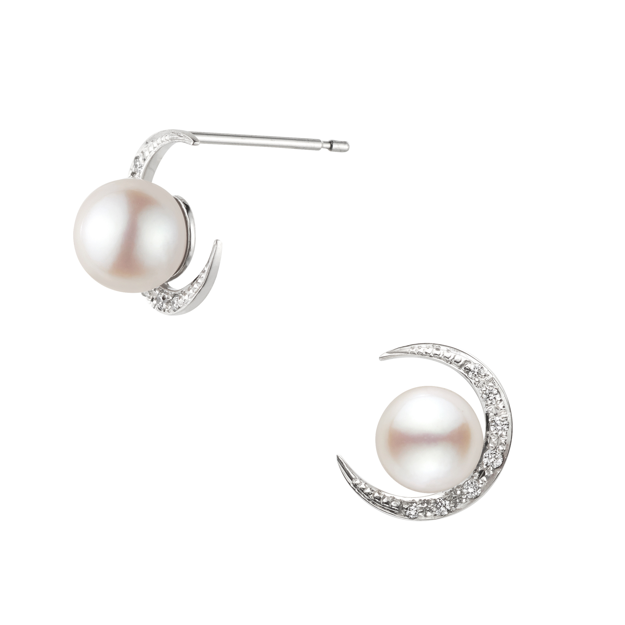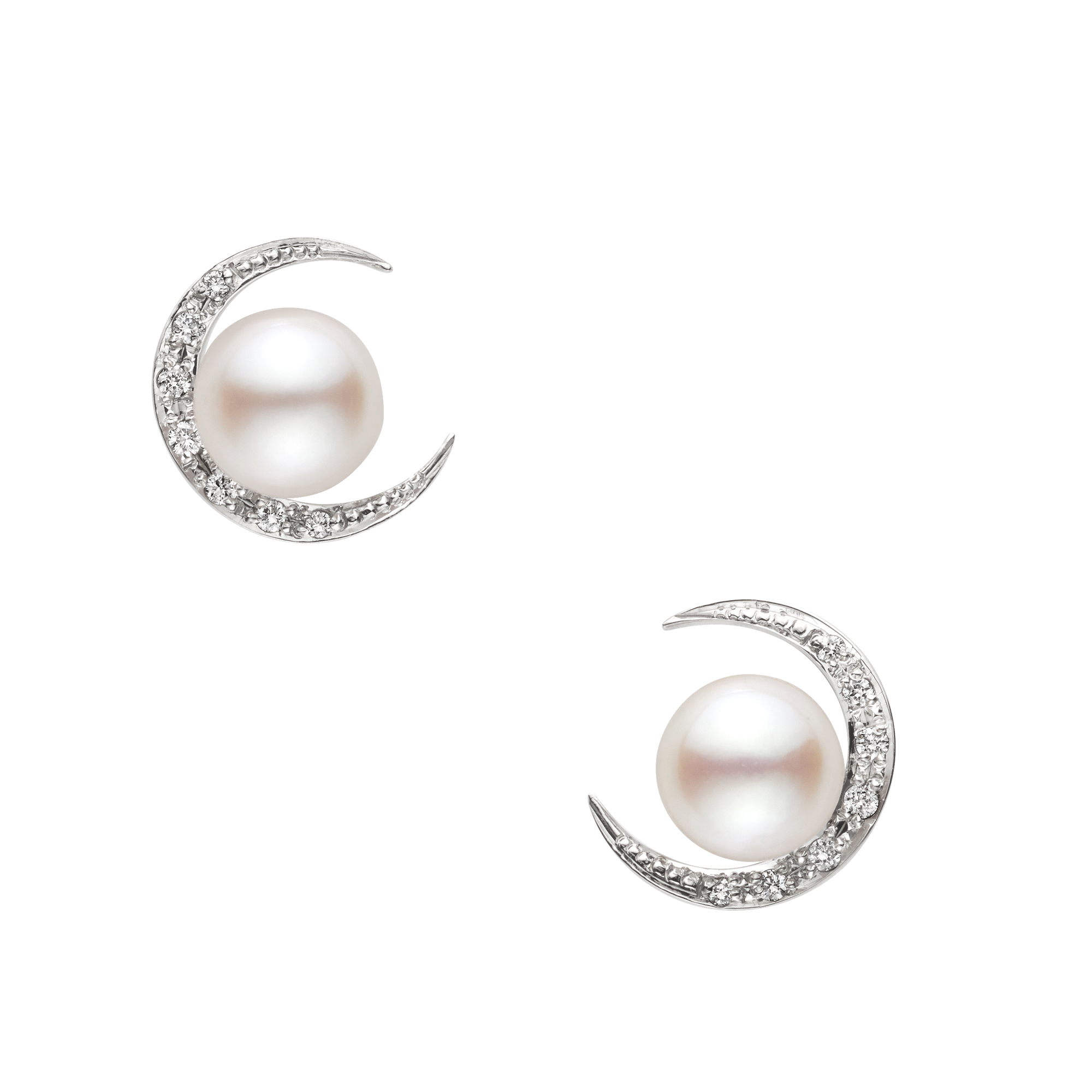 パールを取り巻くように配されたダイヤモンドのきらめきがエレガントさをプラスし、三日月にあしらわれたプラチナの粒が繊細な印象を際立たせています。