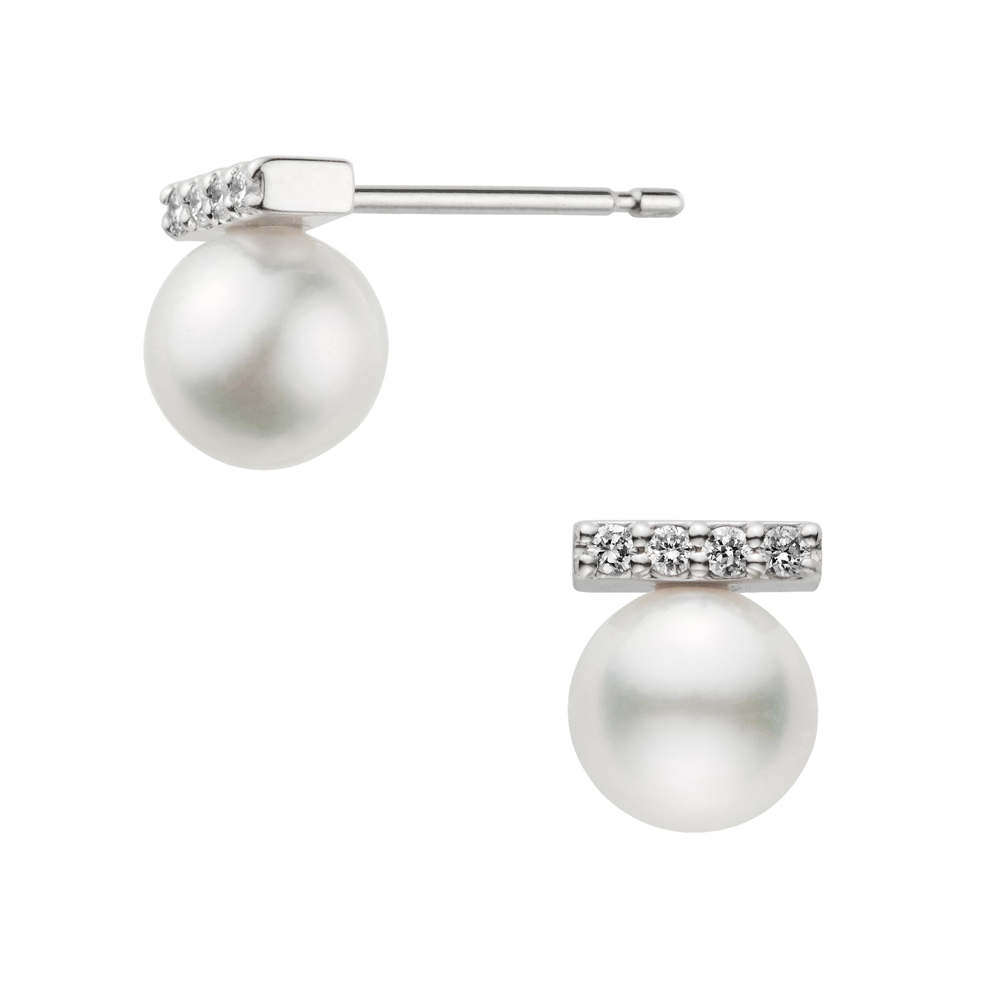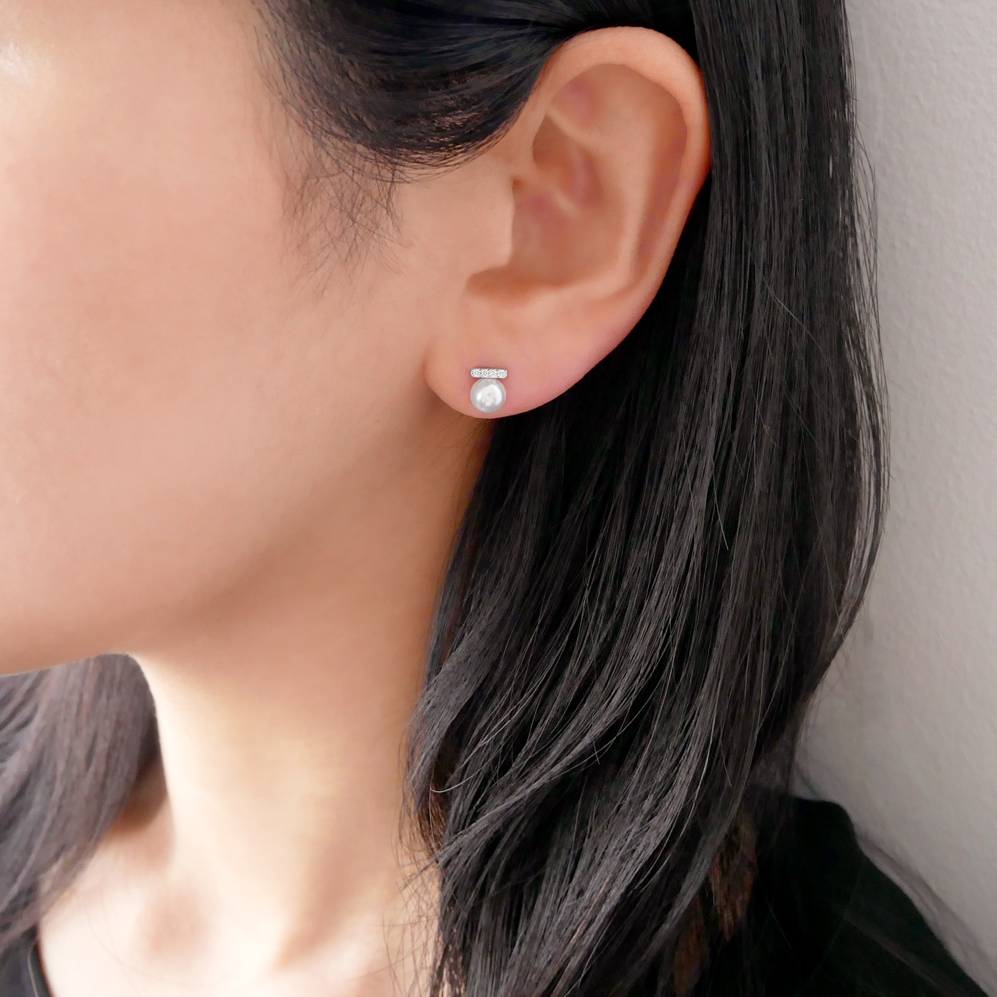 ひとすじのダイヤモンドのラインと、白く柔らかく輝くアコヤパールを組み合わせたピアス。