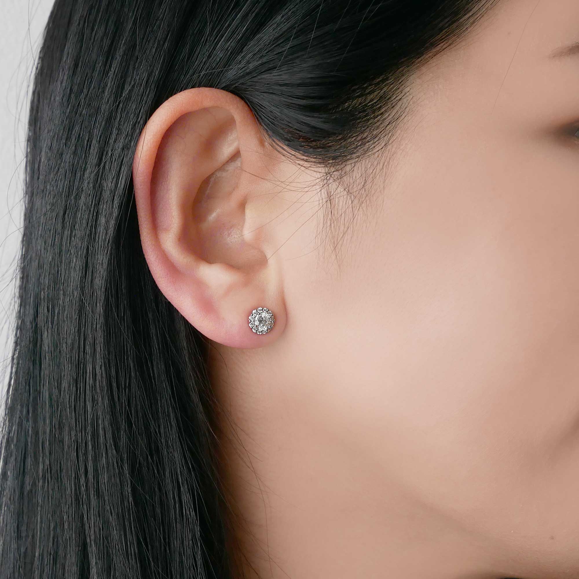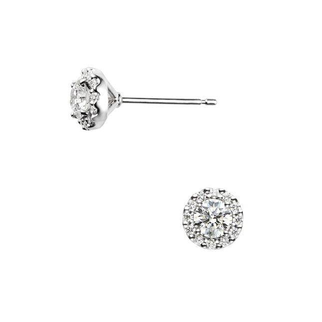 粒選りの一粒ダイヤモンドを繊細なメレダイヤモンドで縁取ったピアス。