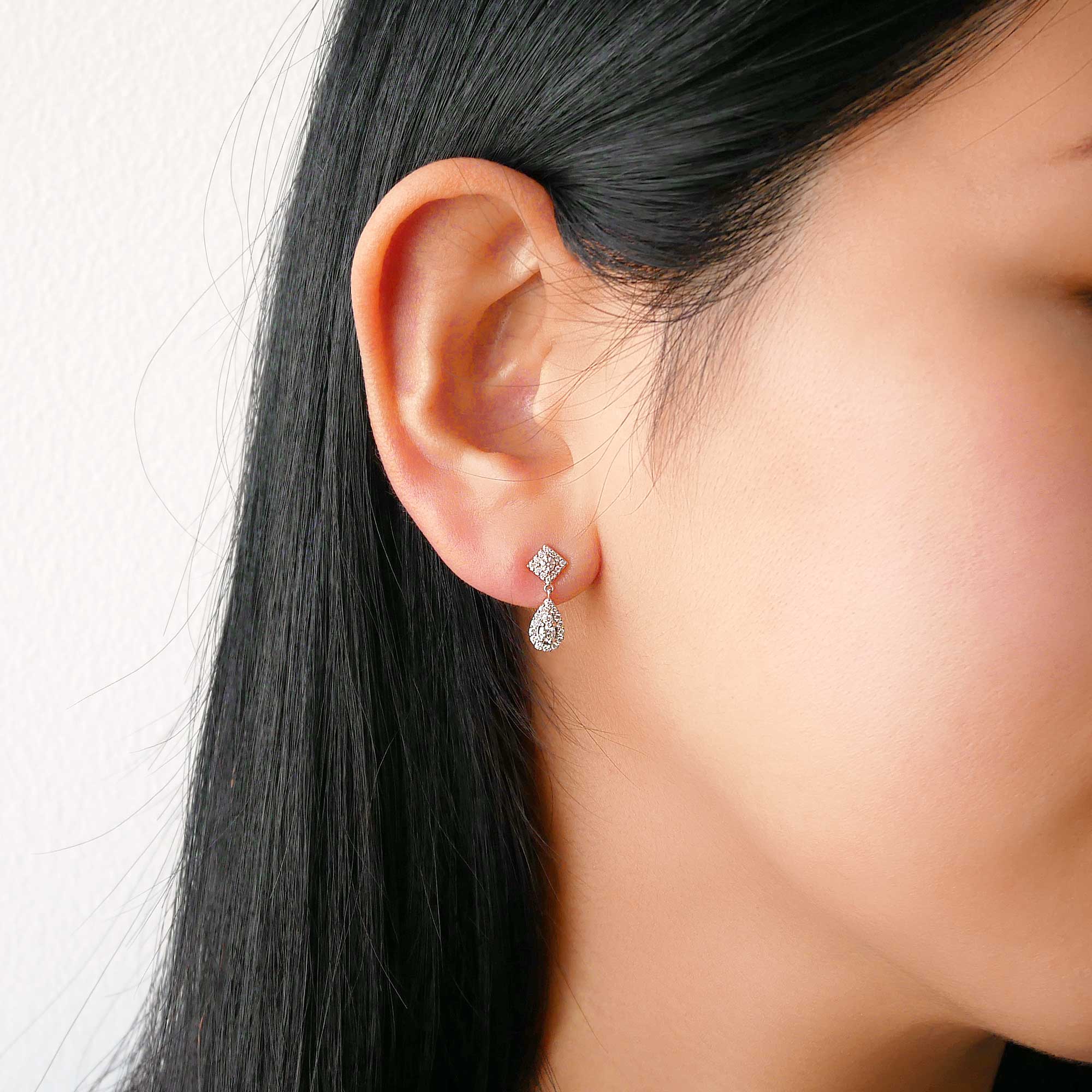 煌めくセンターダイヤモンドを繊細なメレダイヤで取り巻いた、華やかな輝きが印象的なピアス。