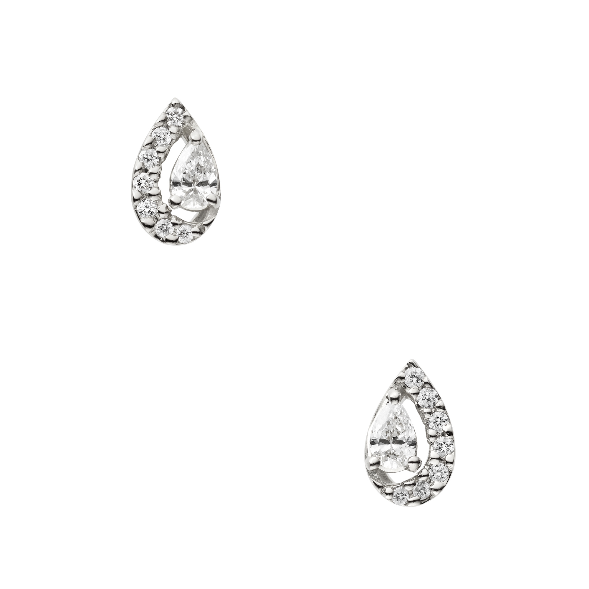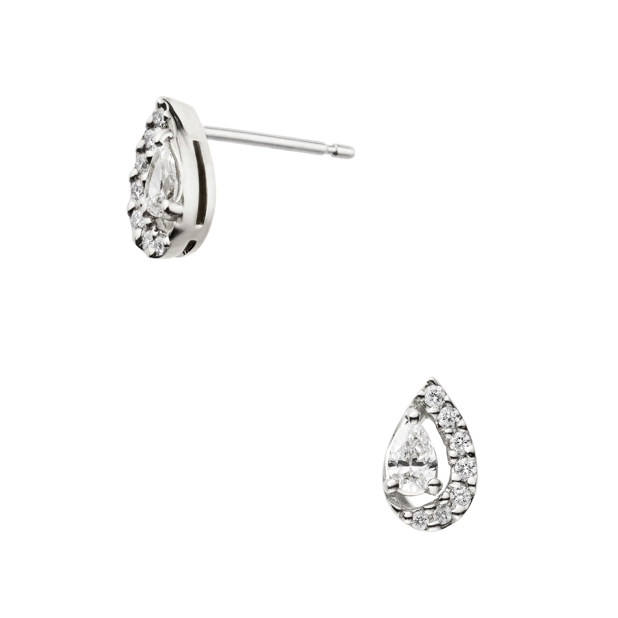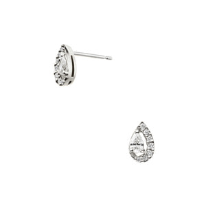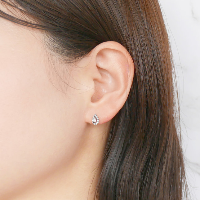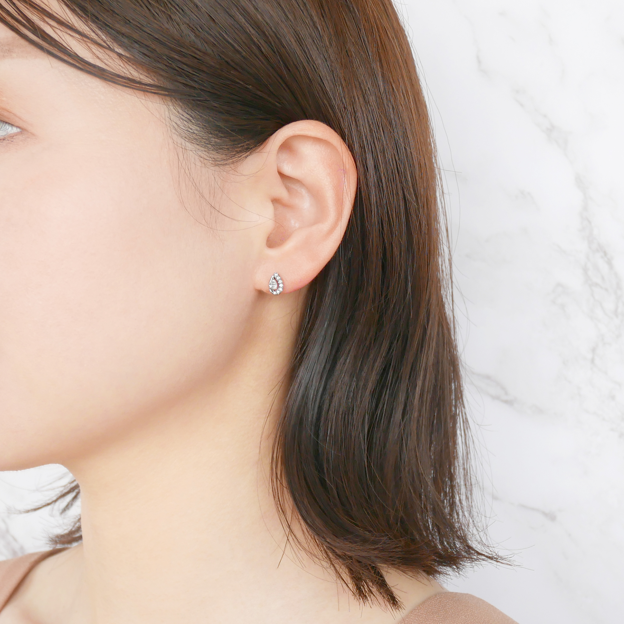 透明感のある煌めきを放つペアシェイプカットダイヤモンドを、繊細なメレダイヤモンドで包み込んだ、潤い溢れる輝きが魅力のピアス。