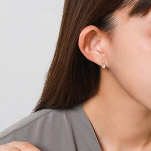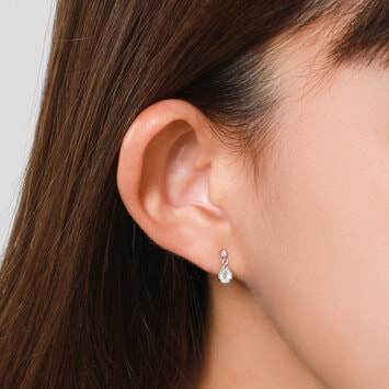 しずく型のミルキーアクアマリンが揺れ動き、横顔にフェミニンなきらめきをプラス。