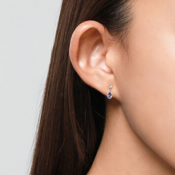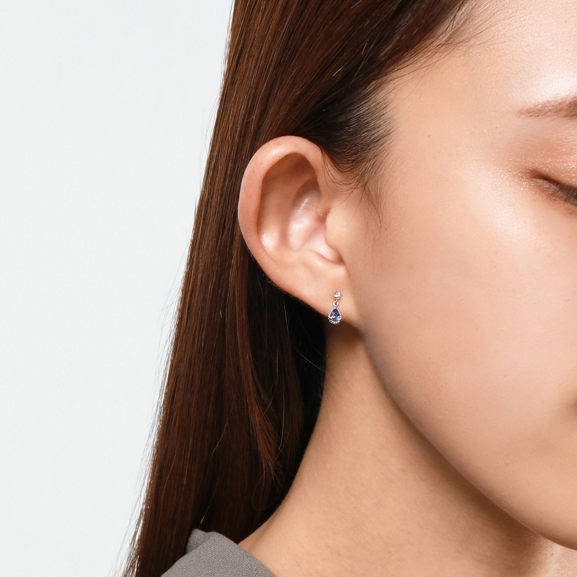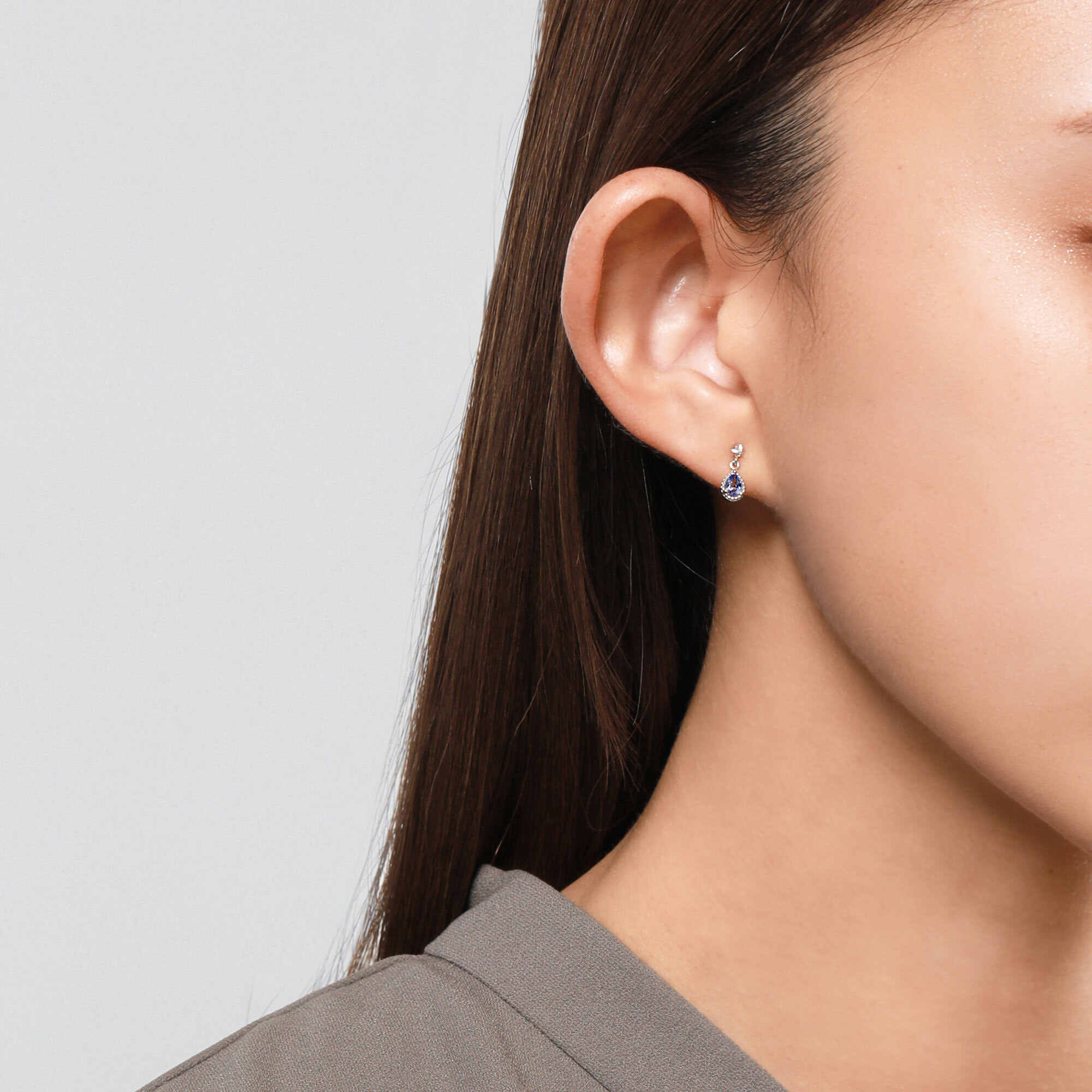 しずく型のタンザナイトが揺れ動き、横顔にフェミニンなきらめきをプラス。
