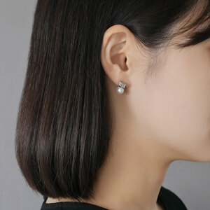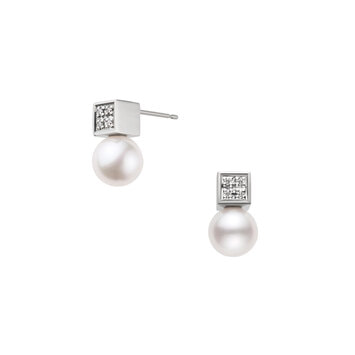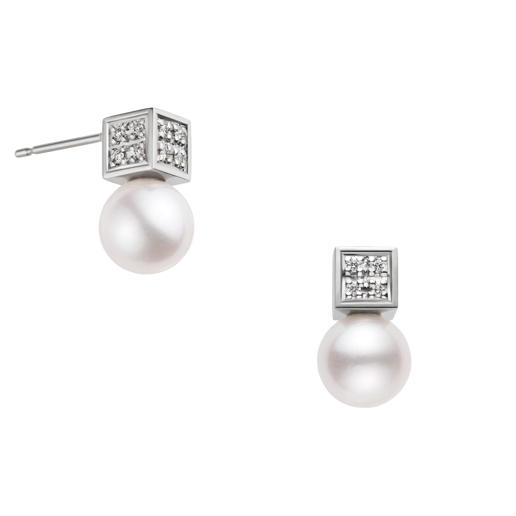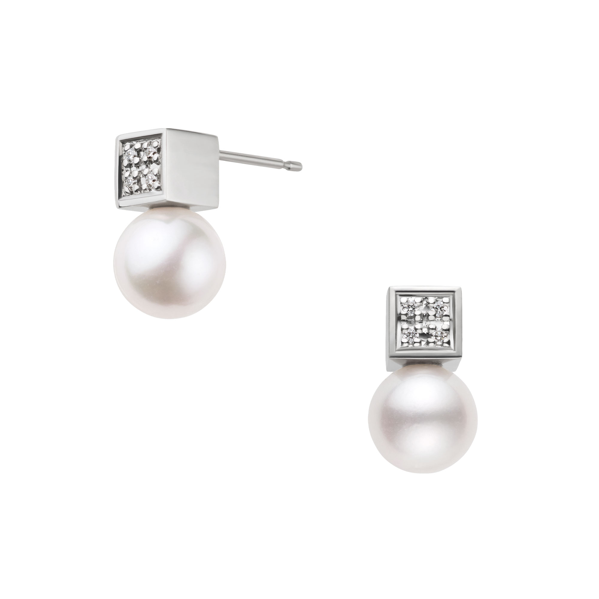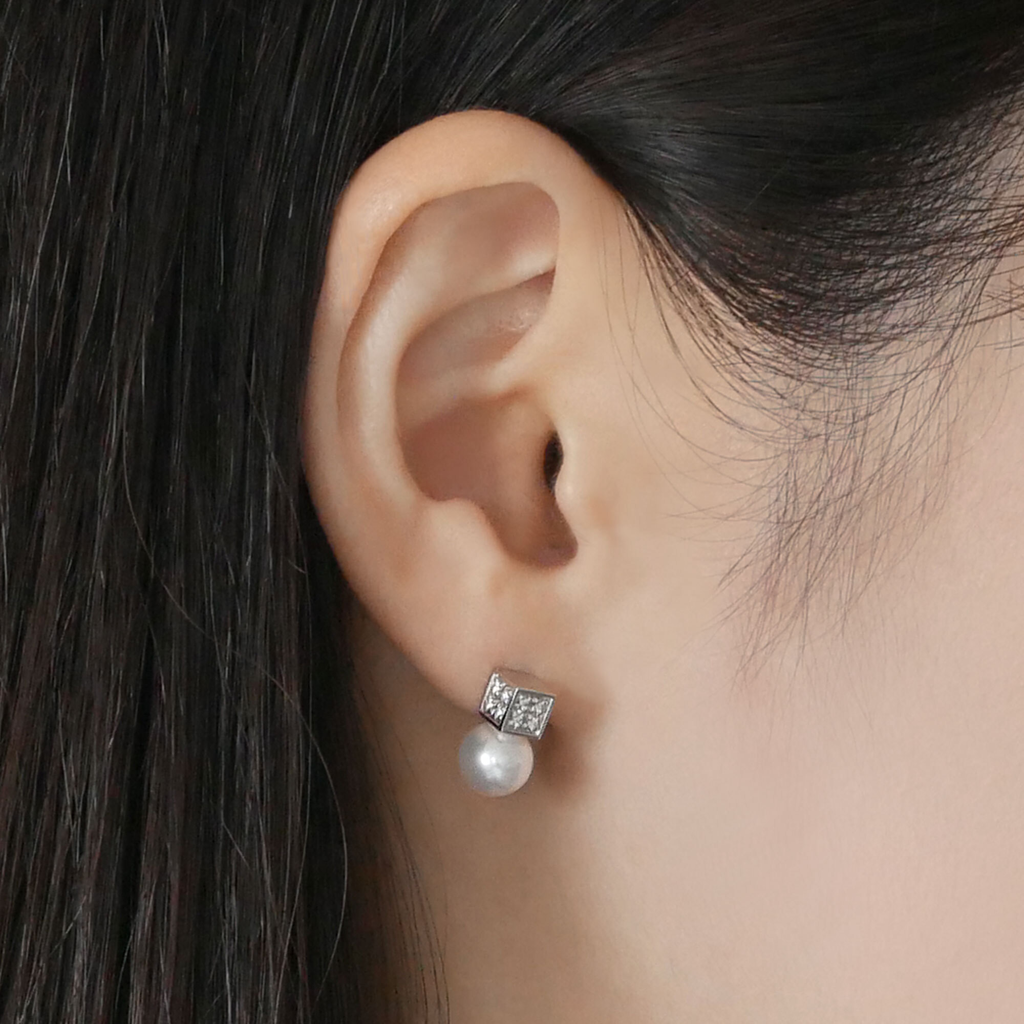 丸いパールとプラチナのキューブを並べた、モダンアートのようなピアス。