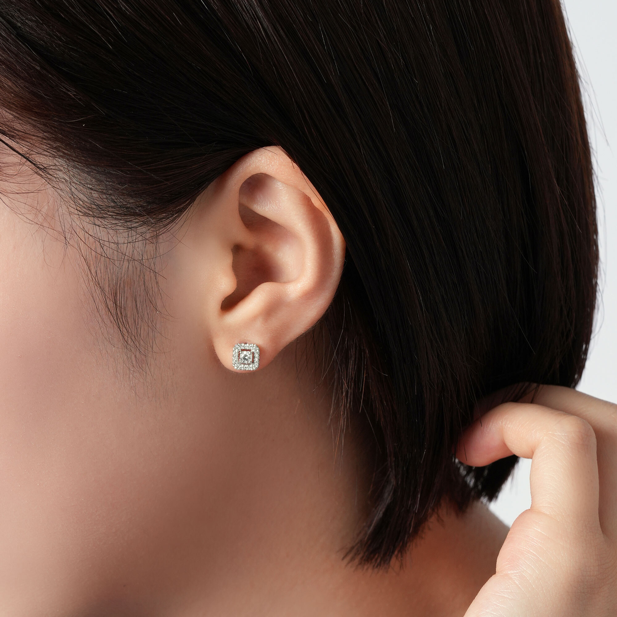 上質な輝きを放つダイヤモンドを、メレダイヤモンドをあしらった八角形のフレームで囲んだ、エレガントなピアス。
