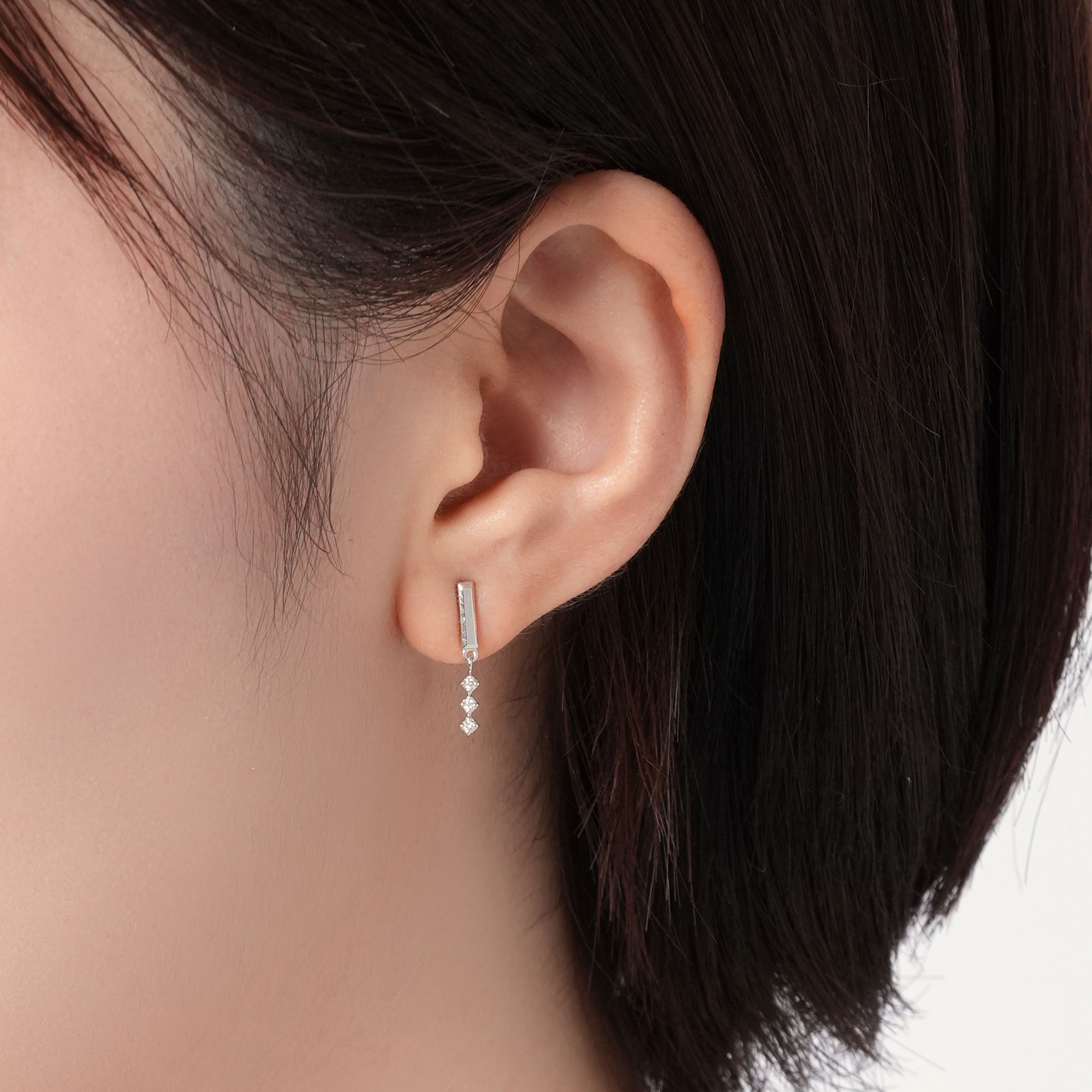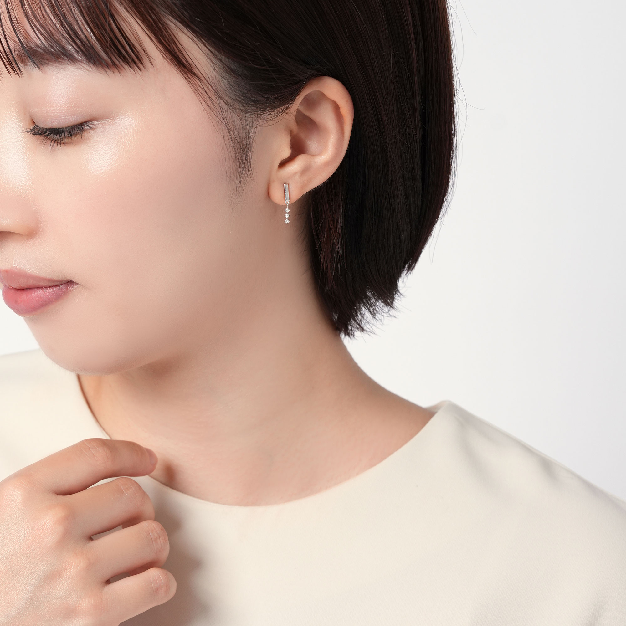 動きに合わせてゆらめく3石のダイヤモンドが、横顔に繊細な輝きをまとわせるピアス。