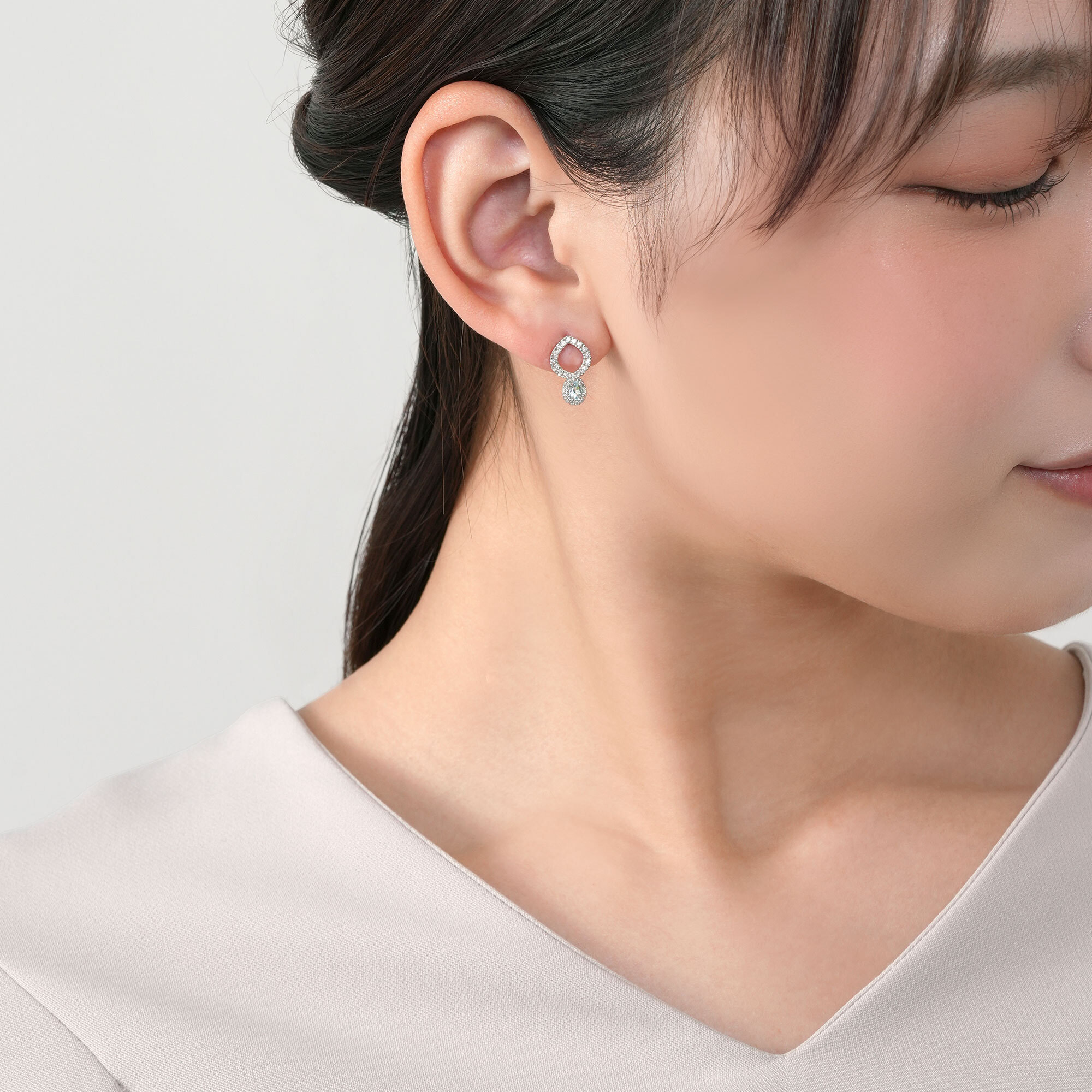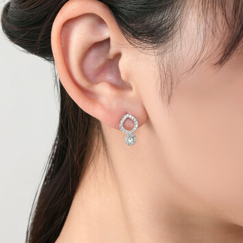 艶やかなプラチナのラインには質の揃った27石のダイヤモンドを片耳ごとに敷き詰め、きらめく光のラインで優しくアクアマリンを包み、華やぎをプラスします。