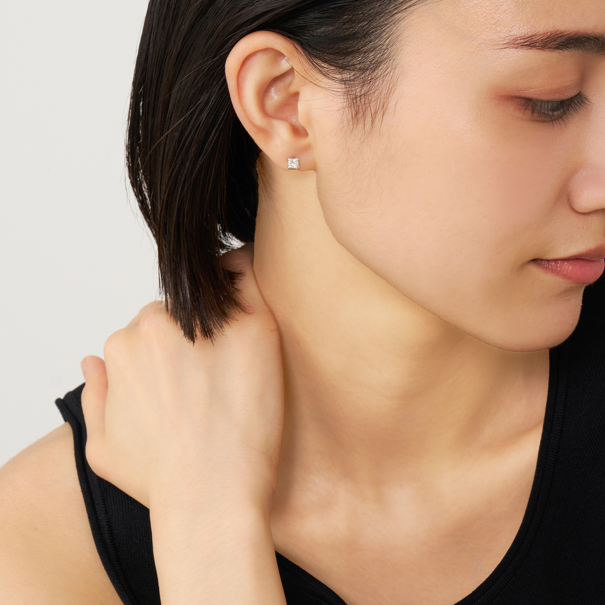プリンセスカットダイヤモンドが眩く輝くシングルピアス。