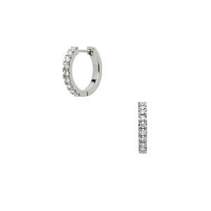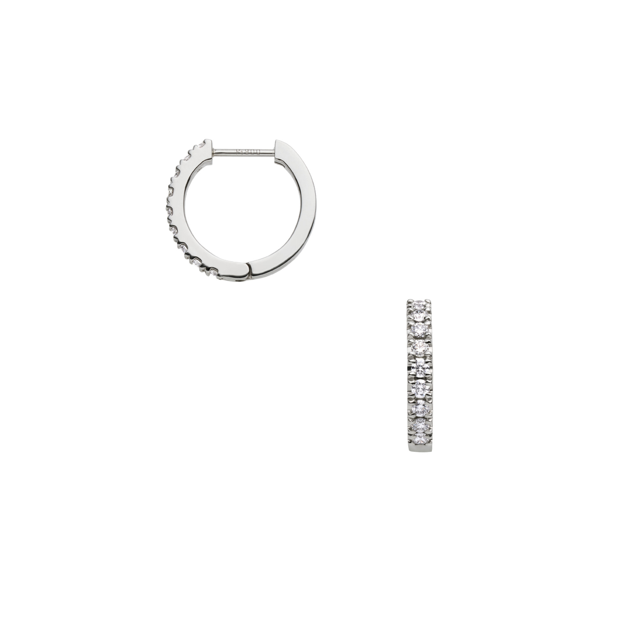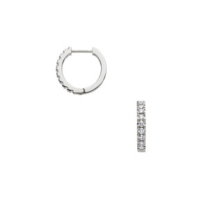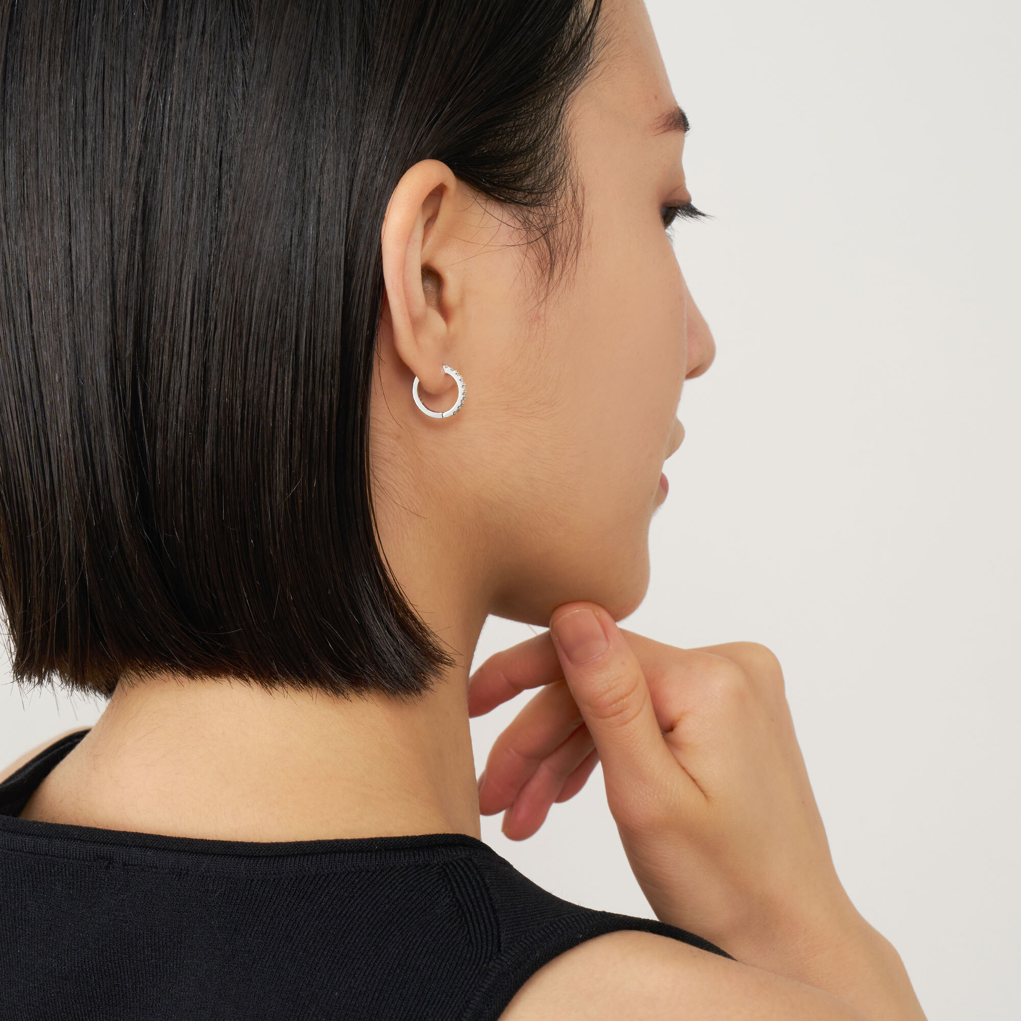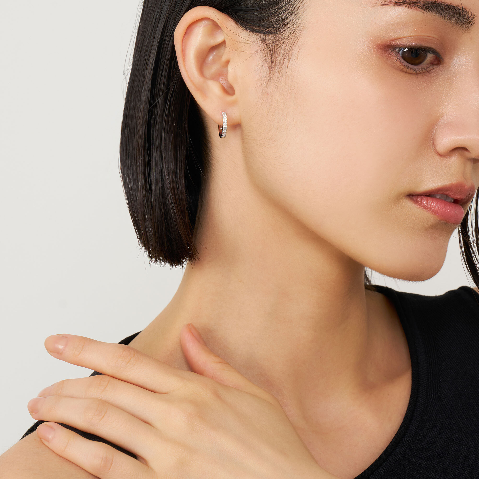 瑞々しく輝くダイヤモンドをプラチナのフープにあしらったベーシックなデザインは、定番であるからこそ細部にこだわり、フラットに仕上げた側面や、キャッチが一体化された作りで洗練された印象に。正面だけでなく横顔も美しく見せてくれます。
